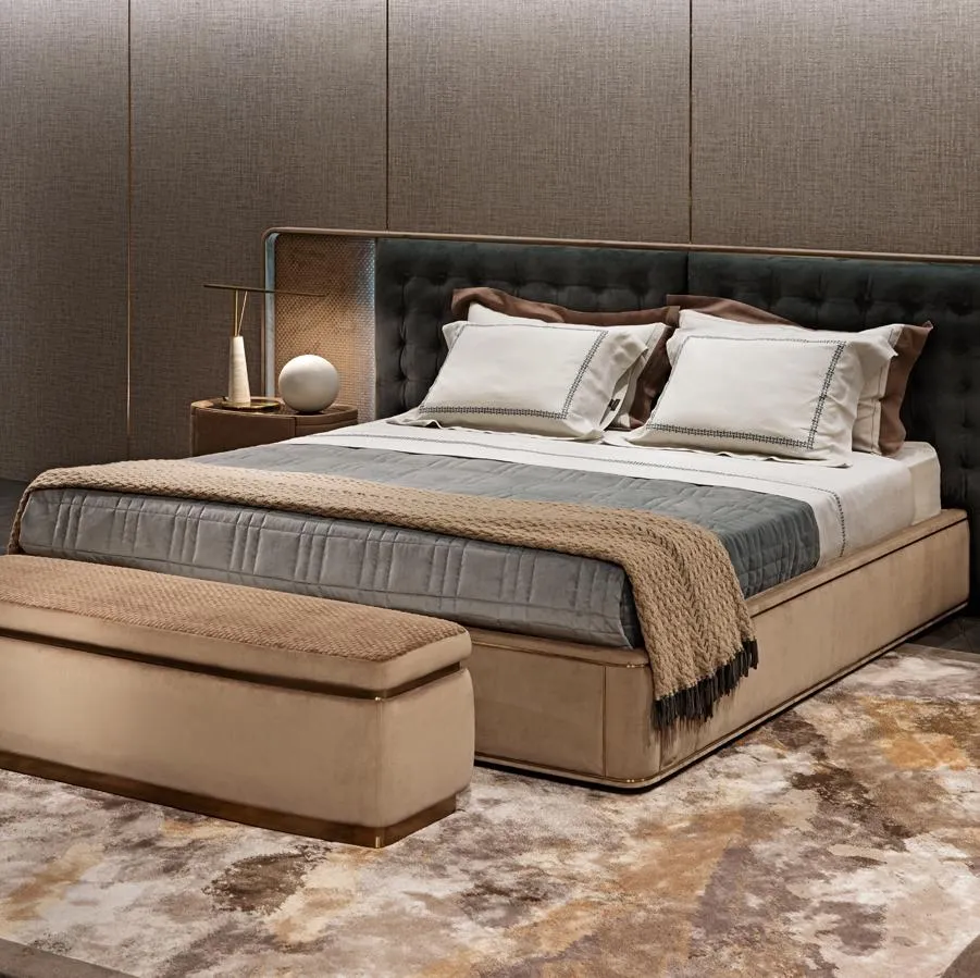 Мягкая кровать со стеганым изголовьем из кожи или ткани, обрамленным деревянным профилем, обтянутым кожей или тканью с металлическим профилем.