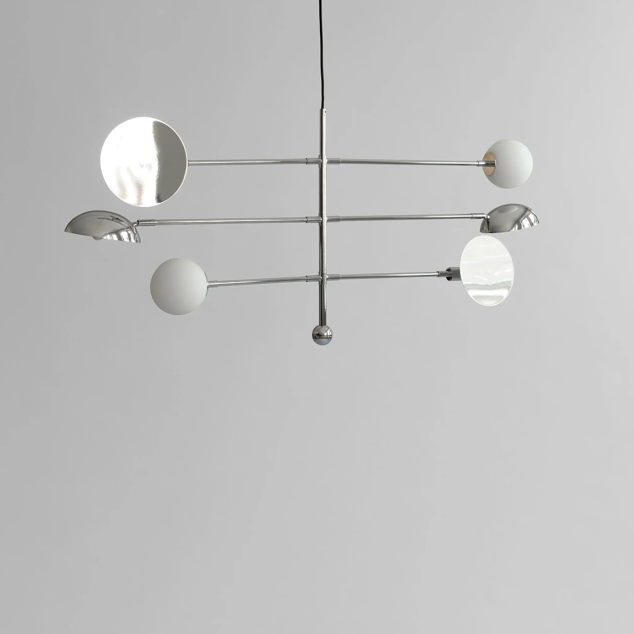 Люстра Sahn , доступная в ярком хромированном или бронзовом исполнении, черпает вдохновение в футуристическом дизайне 1970-х годов и эстетике космической эры. Это неподвластное времени изделие отличается универсальностью: каждый кронштейн и абажур могут поворачиваться, что позволяет создавать динамичное скульптурное освещение, адаптированное к вашему пространству.