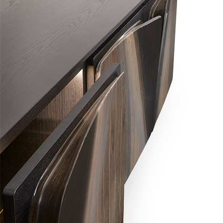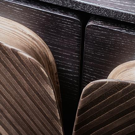 Комод из ясеня, антрацитово-серого цвета (арт.93), с отделкой из массива дерева. Четыре выдвижных ящика с декоративными дверцами из березовой фанеры тщательно подобраны и изготовлены таким образом, чтобы создавалось ощущение движения на ветру. Ручная отделка от Draga & Aurel использует эпоксидную смолу, которая делает каждую дверцу и шкаф по-настоящему уникальным изделием.