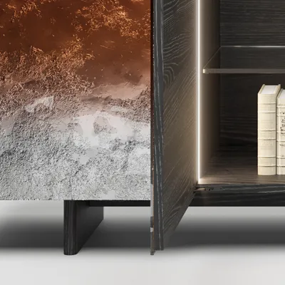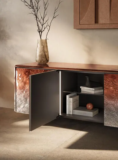 Буфет Scoio из литого стекла/ Декор из двухслойного запечённого стекла с неровными краями. Все элементы окрашены в градиентный цвет от бронзового до прозрачного, а также посеребрены с лёгкой античной отделкой на задней стороне.