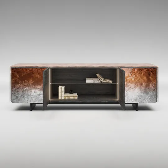 [PREVIEW_TEXT] => Буфет Scoio из литого стекла/ Декор из двухслойного запечённого стекла с неровными краями. Все элементы окрашены в градиентный цвет от бронзового до прозрачного, а также посеребрены с лёгкой античной отделкой на задней стороне.