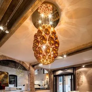 Дизайнерская подвесная люстра Uovo Sculpture Large от Lasvit - это сказочная игра света, вызывающая лучшие эмоции. Художник Рони Плесл создал светильники Уово в виде скопления овальных элементов в форме яйца. Зеркальная поверхность отражает окружающие предметы, преумножая их во много раз. Исходящий изнутри свет, рисует яркие узоры на подвесках, словно жар-птица кроется где-то в недрах этого великолепия. Люстра Uovo подобна целой горе драгоценных камней, играющих переливами на своих поверхностях и манящих взгляд. Теплый свет только подчёркивает смысл произведения, а три разных цвета позволяют подобрать подвес Uovo под вам интерьер. Говорят, что когда смотришь на фрактал, то зрение и разум успокаиваются. Посмотрите на светильники Uovo - вы чувствуете это?