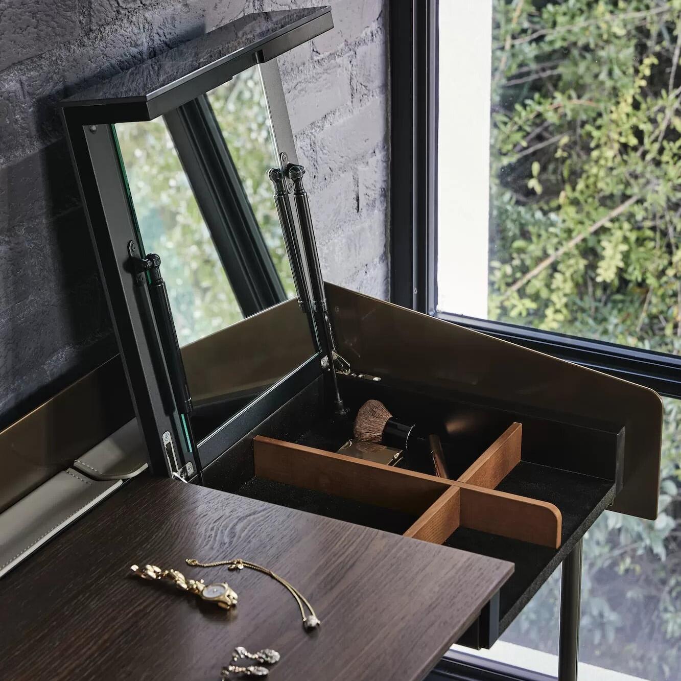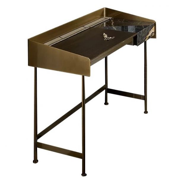 Консоль с рамой и внешним краем из лакированного металлического каркаса, с 3 небольшими отделениями для хранения из натуральной кожи в тон внешнему краю, деревянной столешницей, клапаном для потайного отделения из лакированного дерева или мрамора.