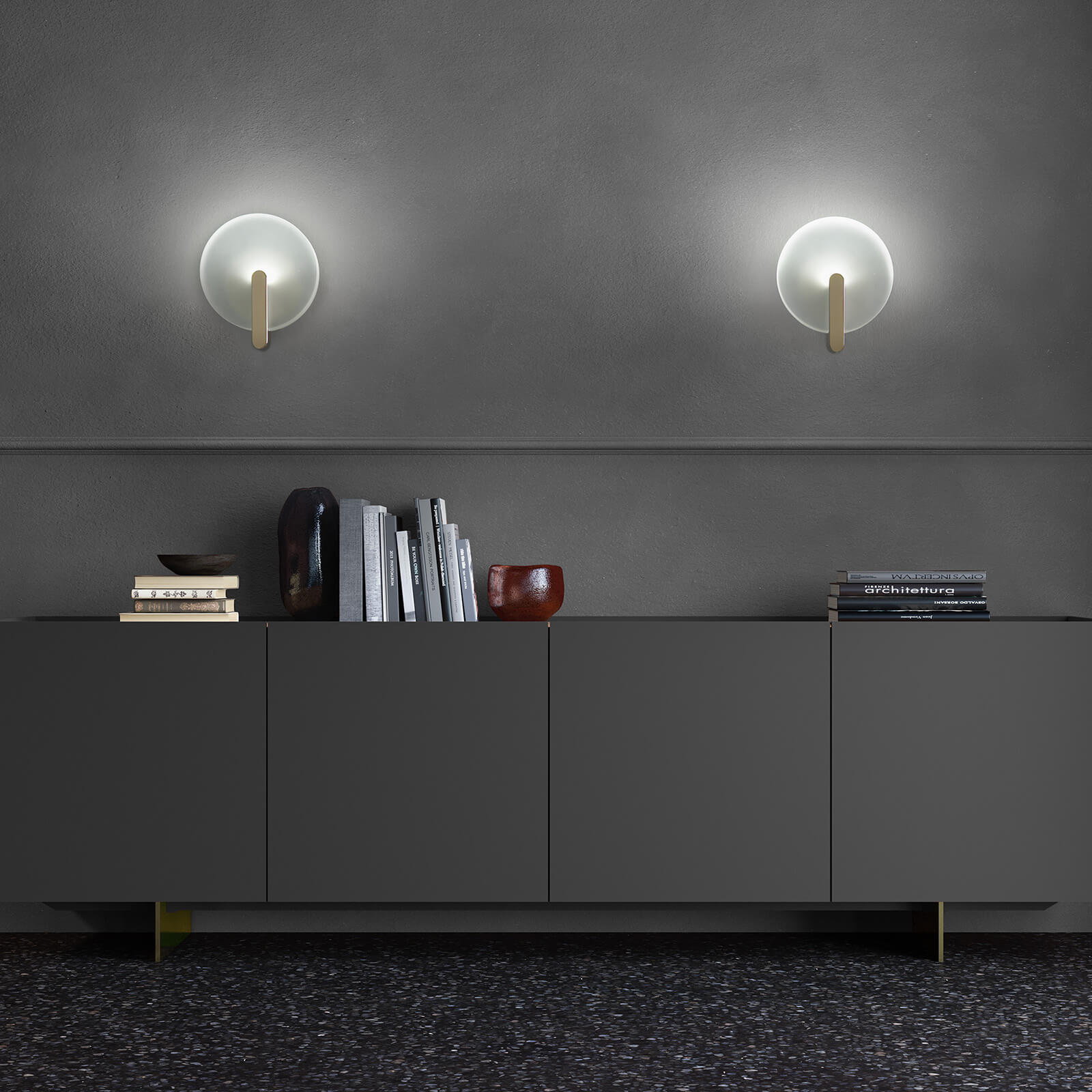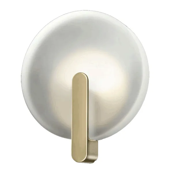 Бра Sinua, 686/AP от фабрики ITALAMP создано из позолоченного металла и мощного матового стекла, сквозь которое пробивается свет, мягко освещая пространство вокруг себя.