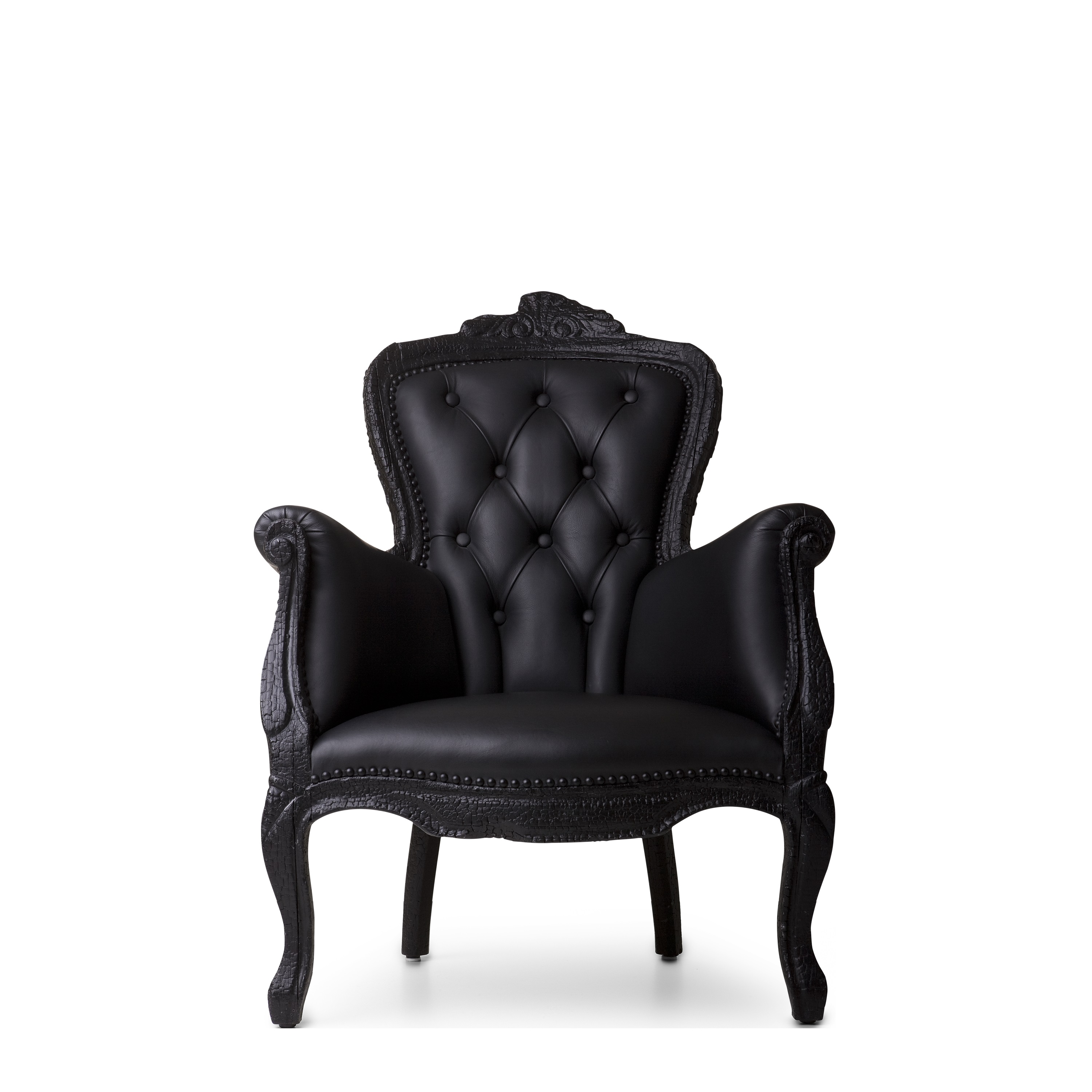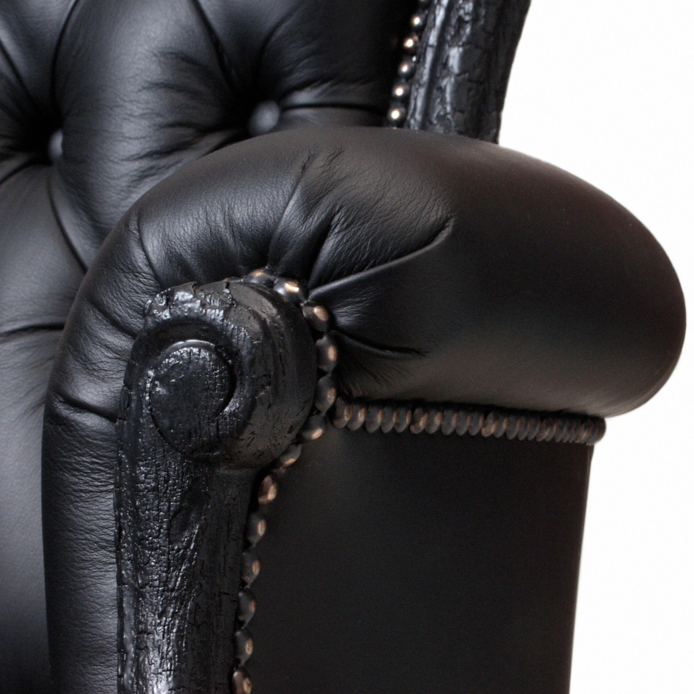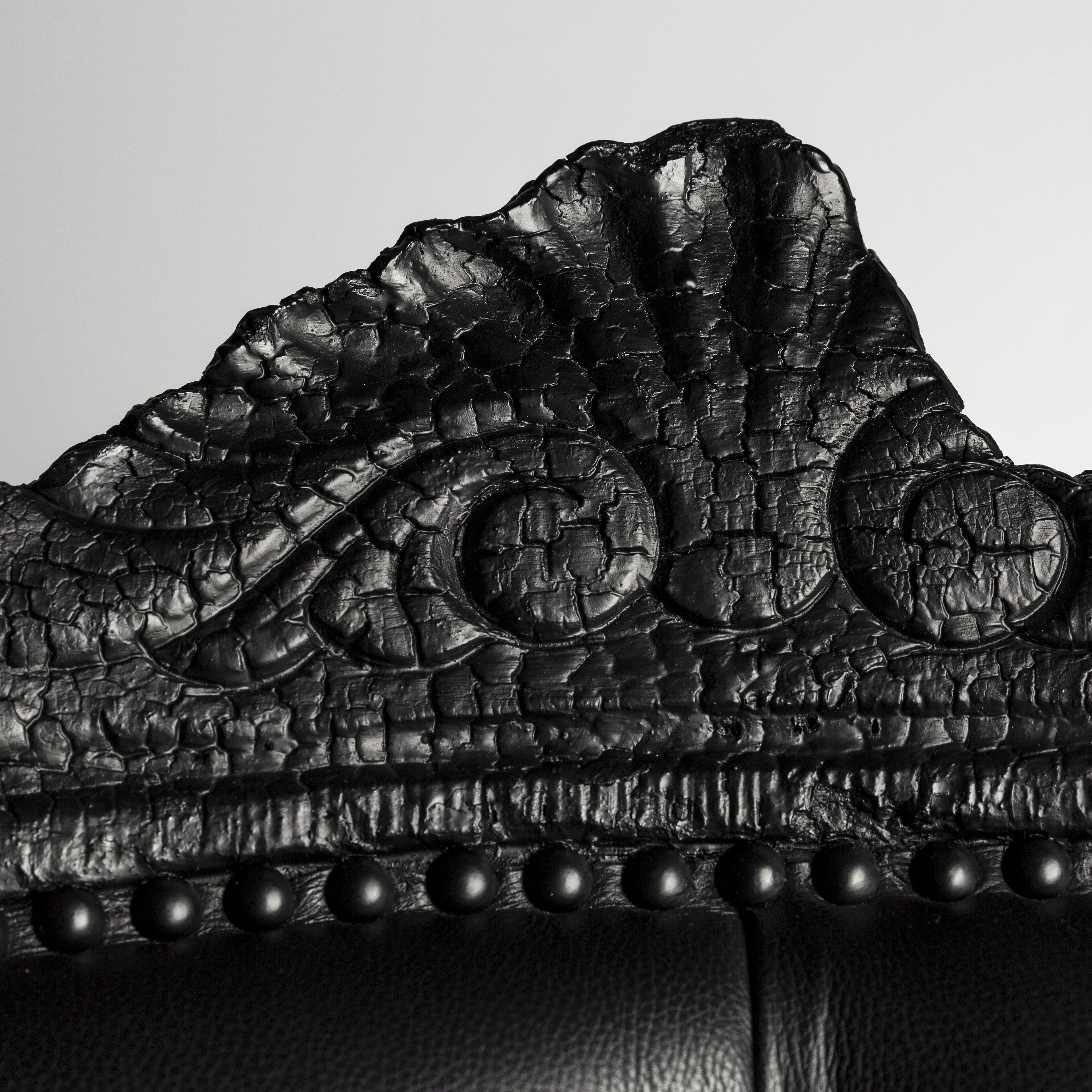 Обожженное дерево, обработанное эпоксидной смолой, огнезащитная пена, кожаная обивка.