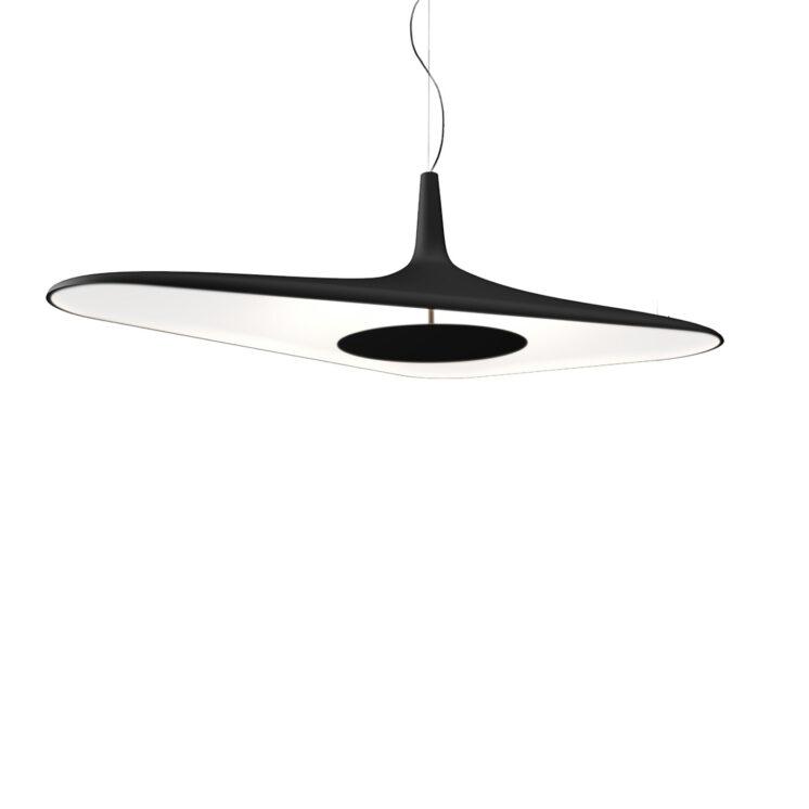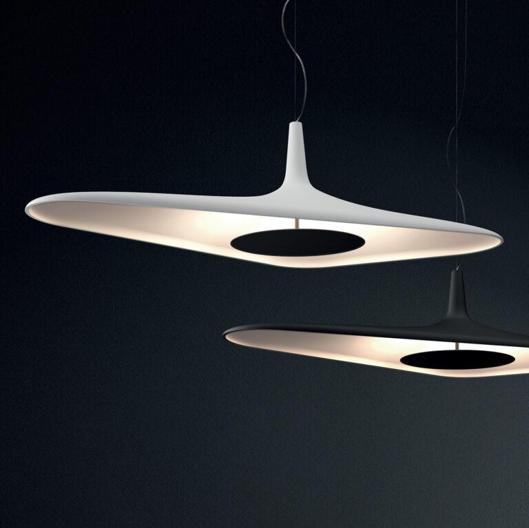 Подвесной или потолочный светильник органичной формы из формованного пенополиуретана, светодиодный источник которого спрятан внутри диска для создания равномерного непрямого рассеянного света.