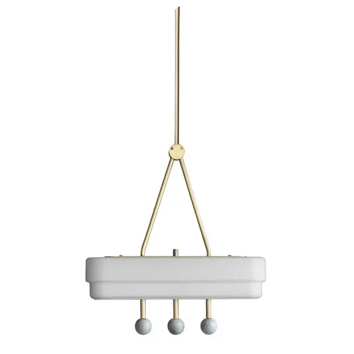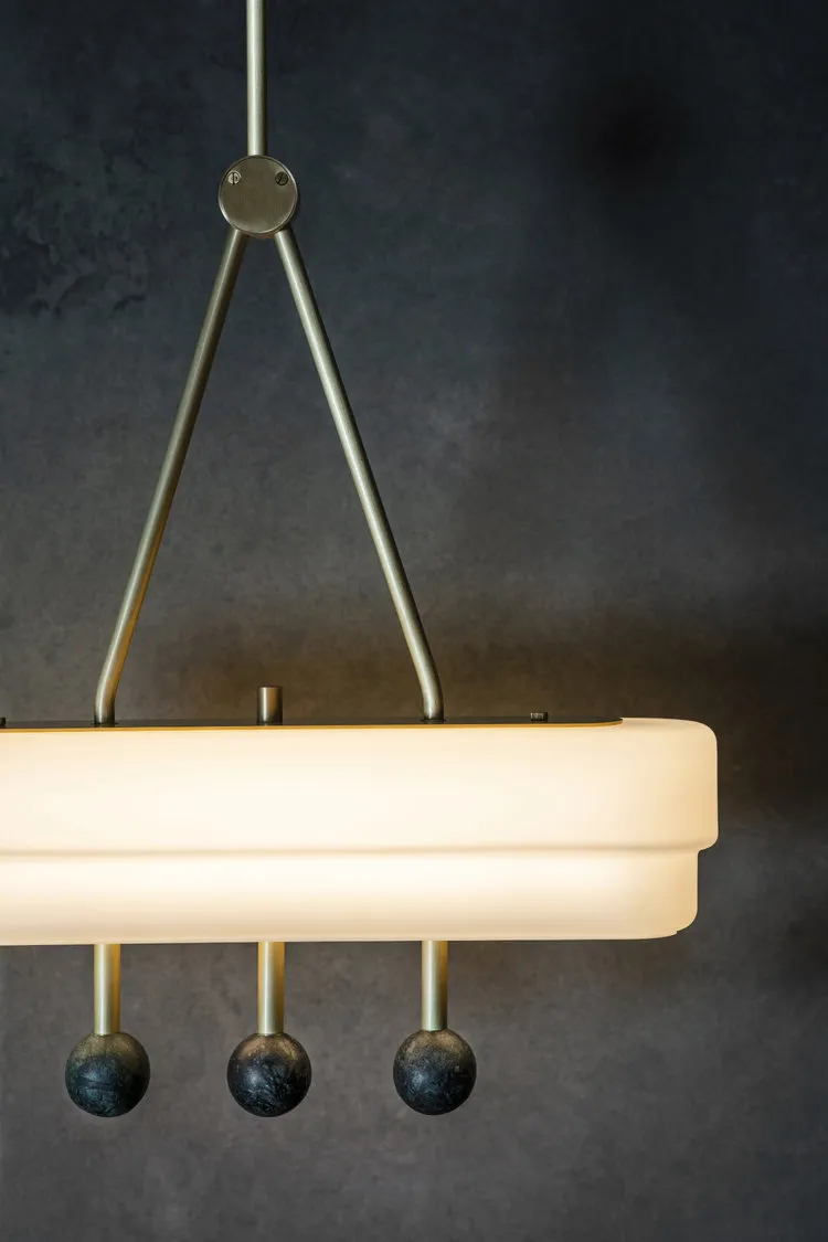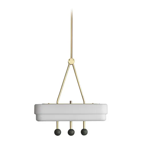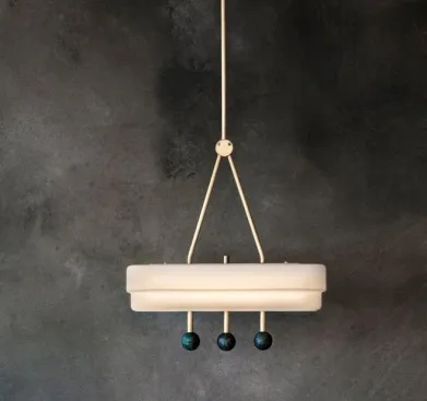 Потолочный светильник Spate, подвешенный на одном латунном основании, излучает мягкий роскошный свет сквозь ступенчатый стеклянный плафон опалового цвета. Зеленые или белые мраморные шары привлекают самый изысканный взгляд.