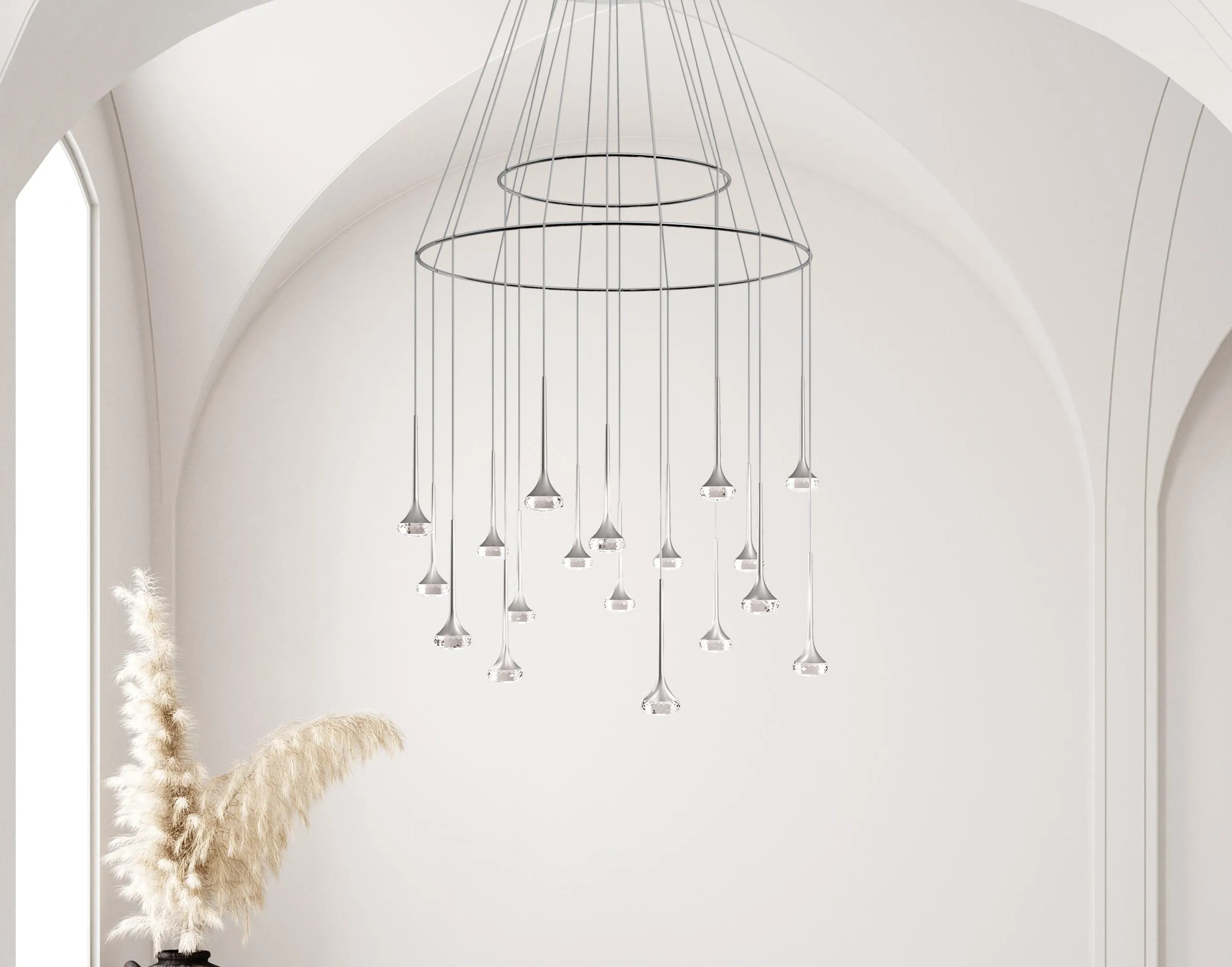Коллекция состоит из встраиваемых светильников, настенных светильников, потолочных светильников и подвесных светильников с хромированной металлической рамой и стеклянным рассеивателем. Доступен в нескольких цветах и размерах. Встроенный (затемняемый для некоторых версий) светодиодный источник света.