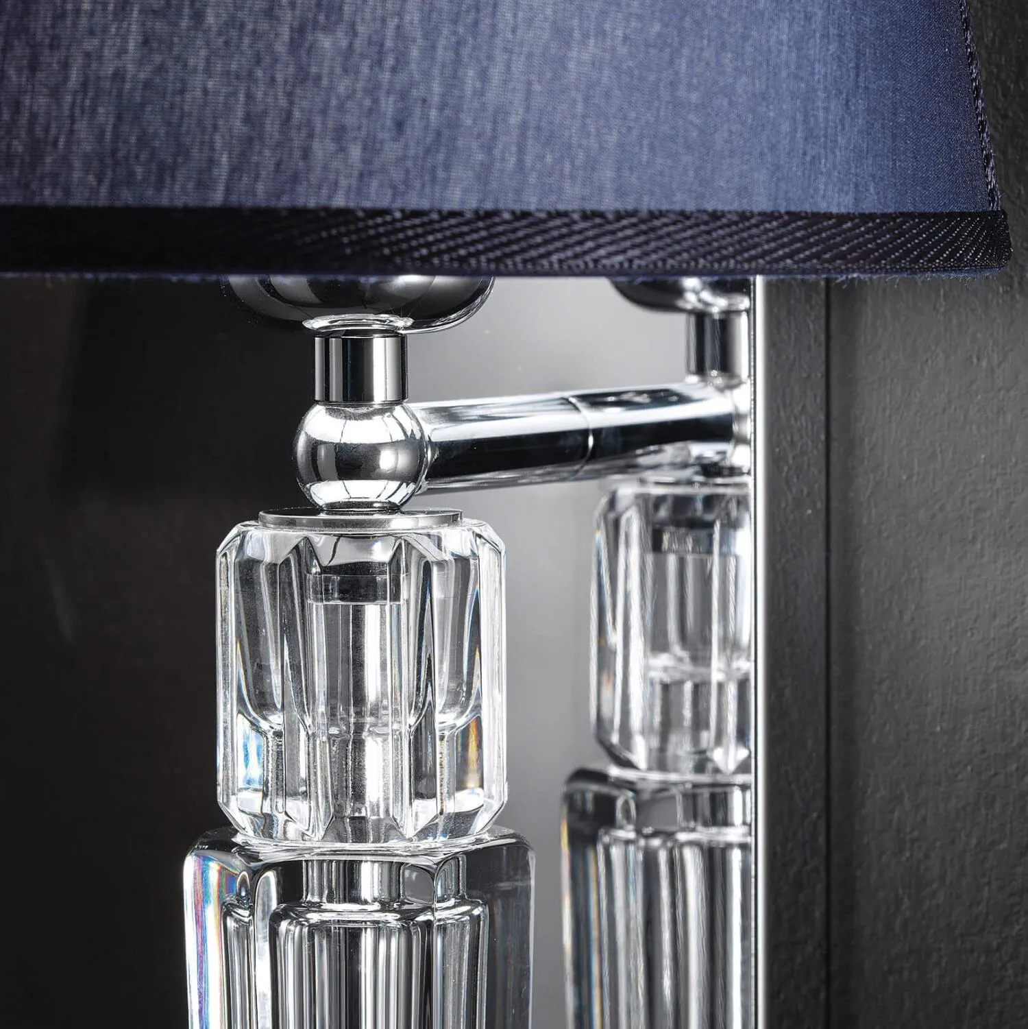 Spillo - это коллекция настольных ламп и бра из резного хрусталя ручной работы с металлической конструкцией и тканевым абажуром.