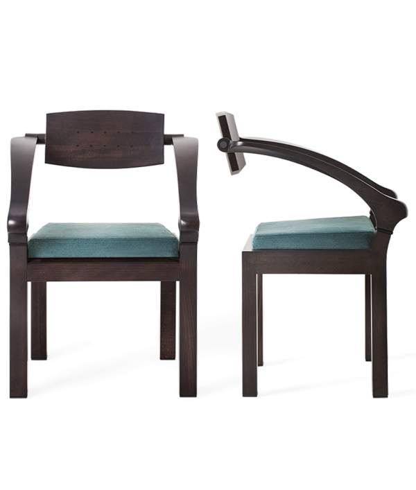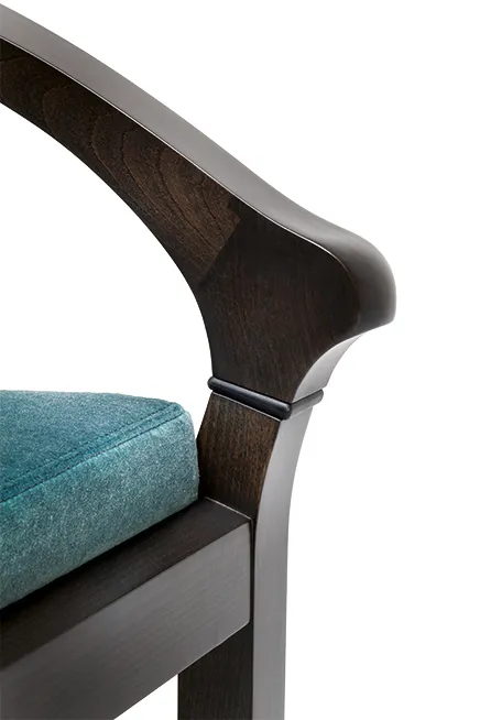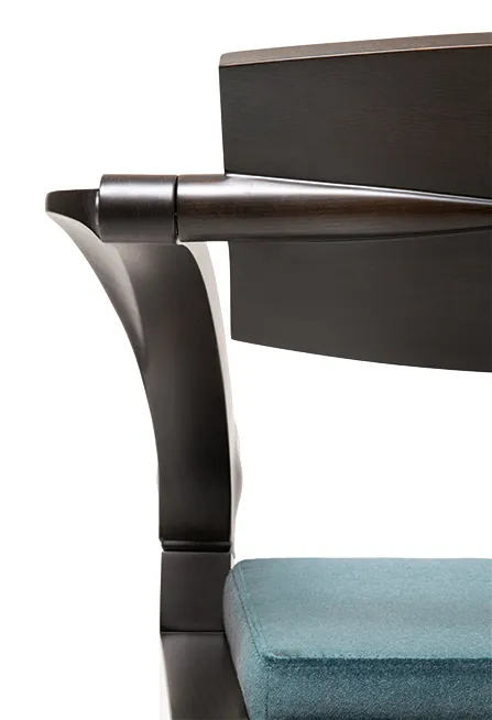 Подлокотники и спинка соединены с сиденьем с помощью детали из массива бука, которая содержит металлический механизм для дополнительного пружинения и эластичности.