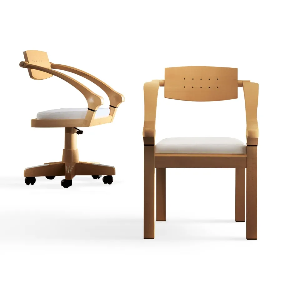 Это небольшое кресло доступно в двух вариантах исполнения: стационарное с ножками, оснащенными подпружиненными колесиками и накладками для ног из ПВХ, и поворотное с четырьмя колесиками и рамой из литого под давлением алюминия, покрытого массивом бука, и вставками подставки для ног из алюминия.