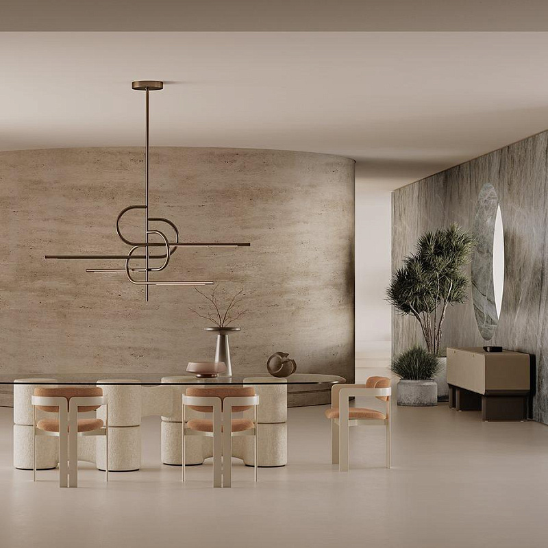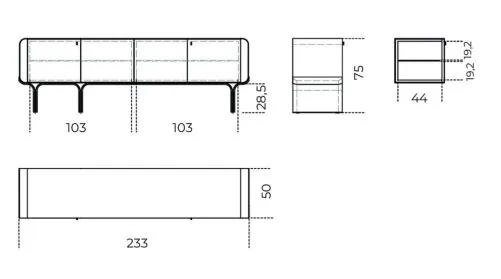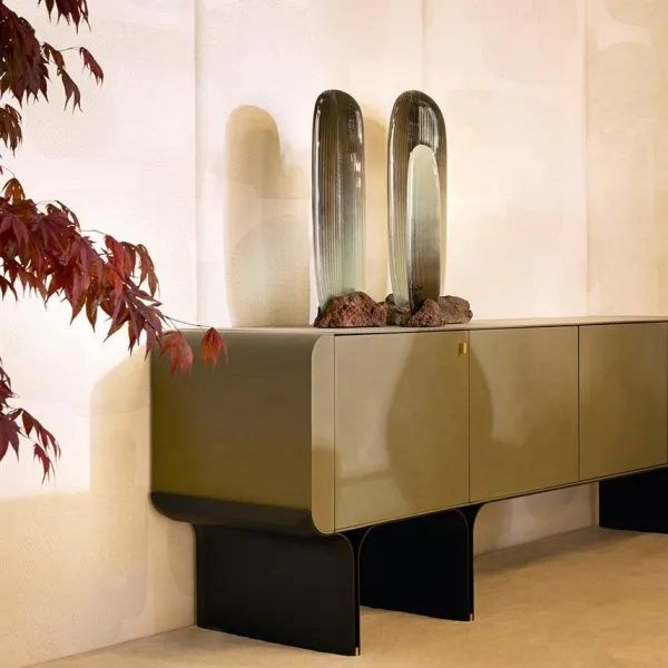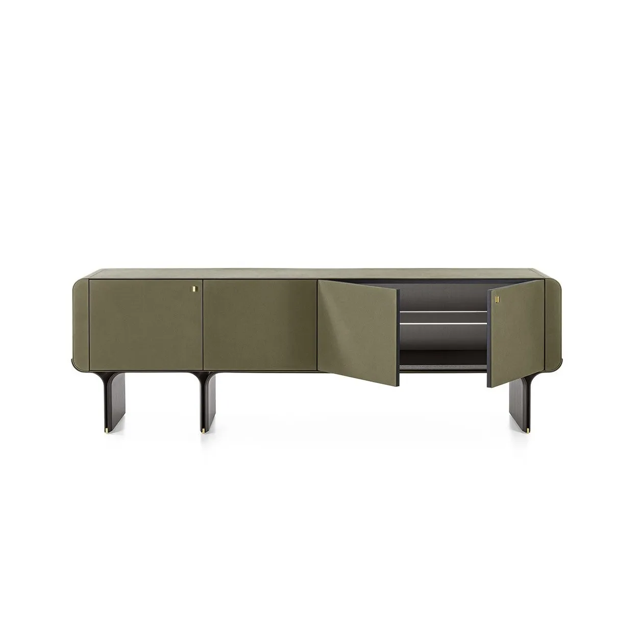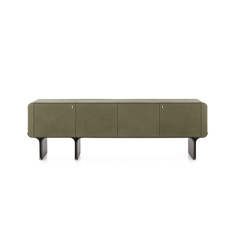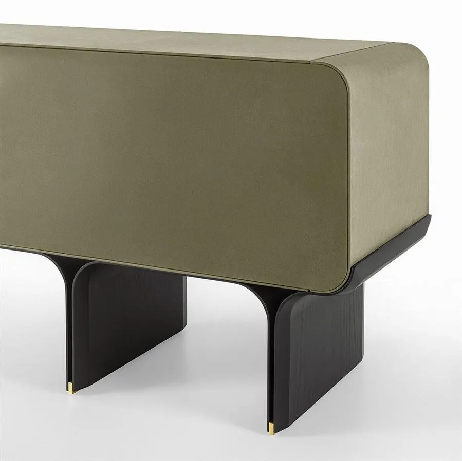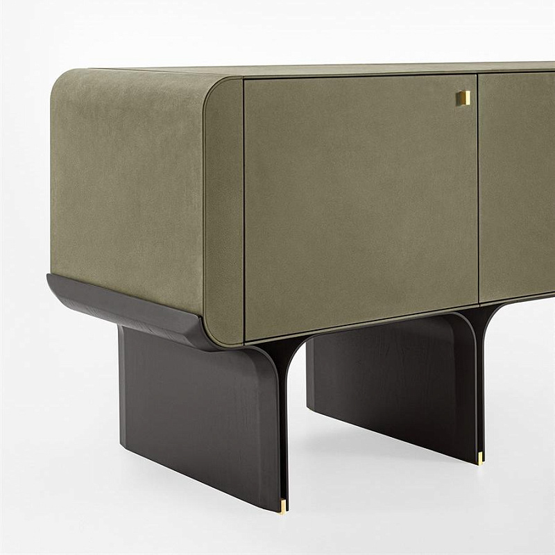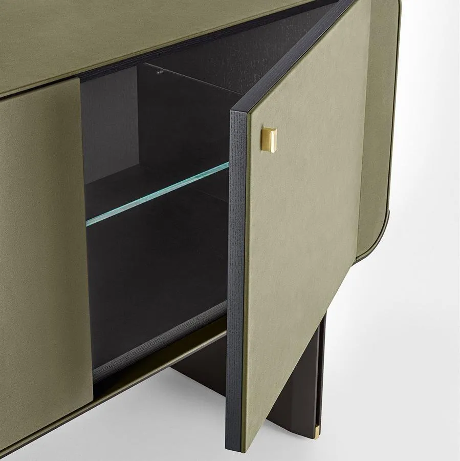 Комод с изогнутым основанием из ясеня, окрашенного в черный цвет с открытыми порами, и яркими латунными деталями. Деревянный корпус обтянут кожаной обивкой в соответствии с образцами. Поставляется с внутренней стеклянной полкой толщиной 8 мм.