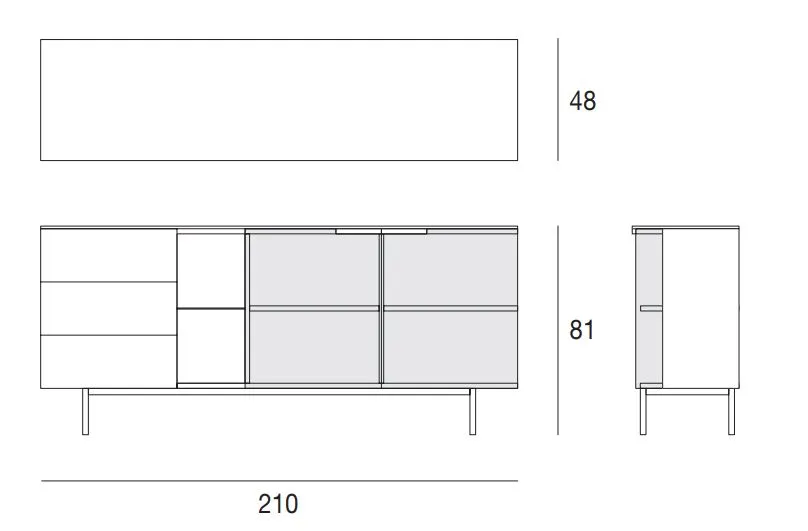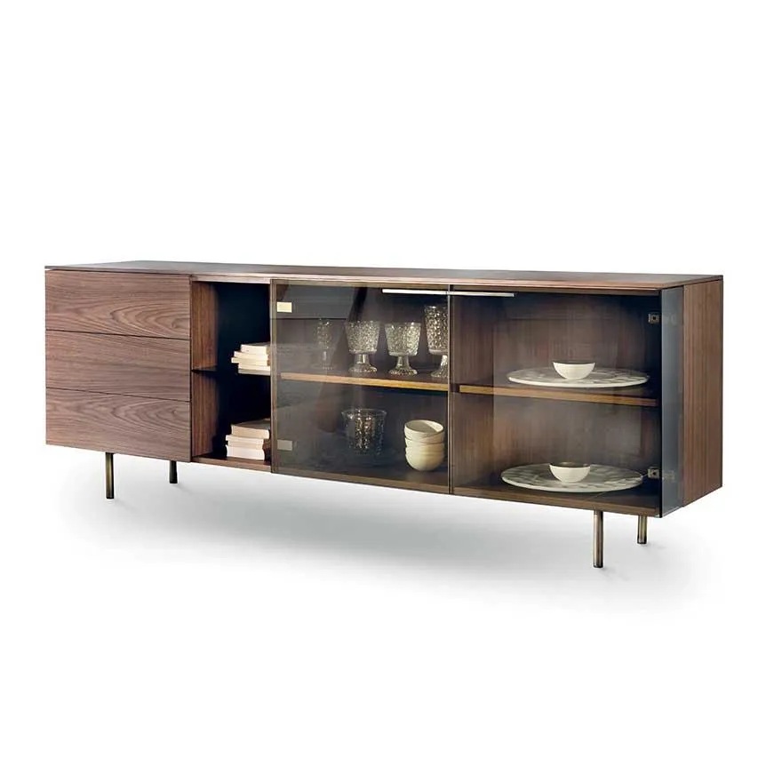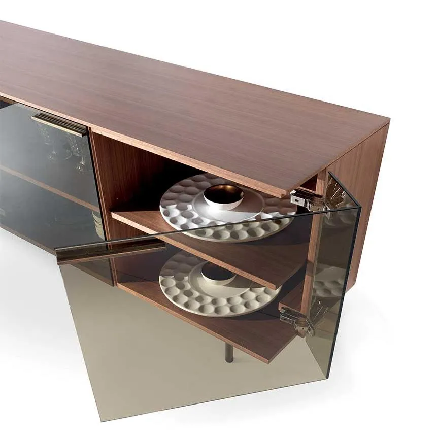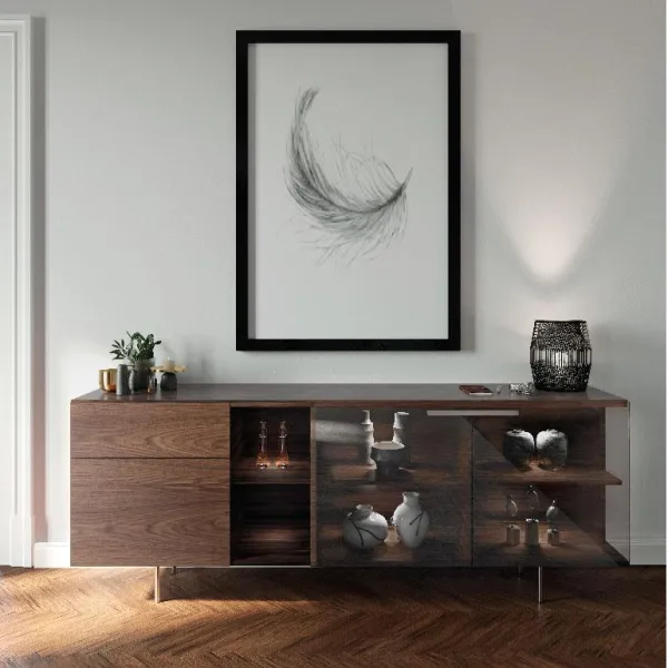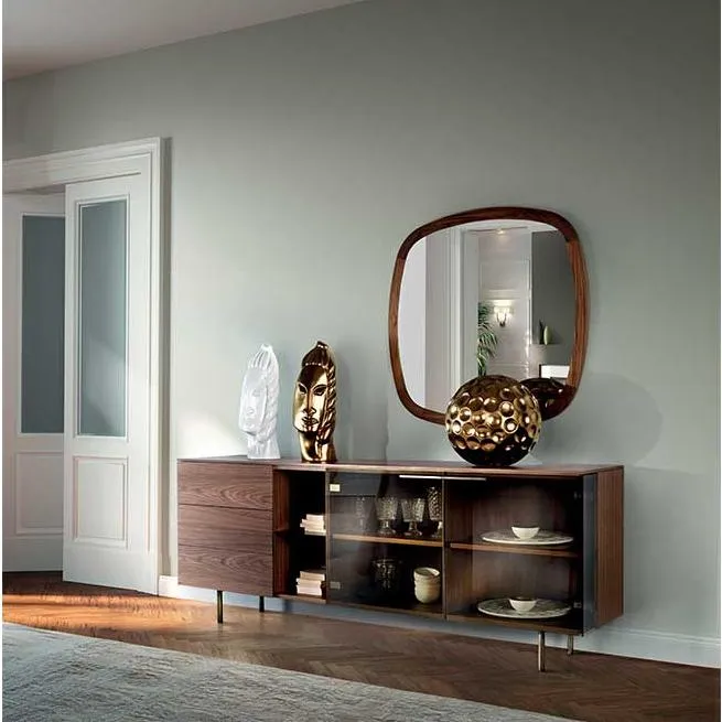 Конструкция из ореха каналетто, слегка опирающаяся на металлическое основание, окрашенное в латунный цвет, в сочетании с ручками, выдвижными ящиками, защищающими наши вещи от любопытных взглядов, открытым отделением и полками, на которых выставлено то, чем мы любим восхищаться. Все это гармонично сочетается, напоминая о шкафах прошлого, которые теперь представлены в новом дизайне. современный и элегантный ключ.