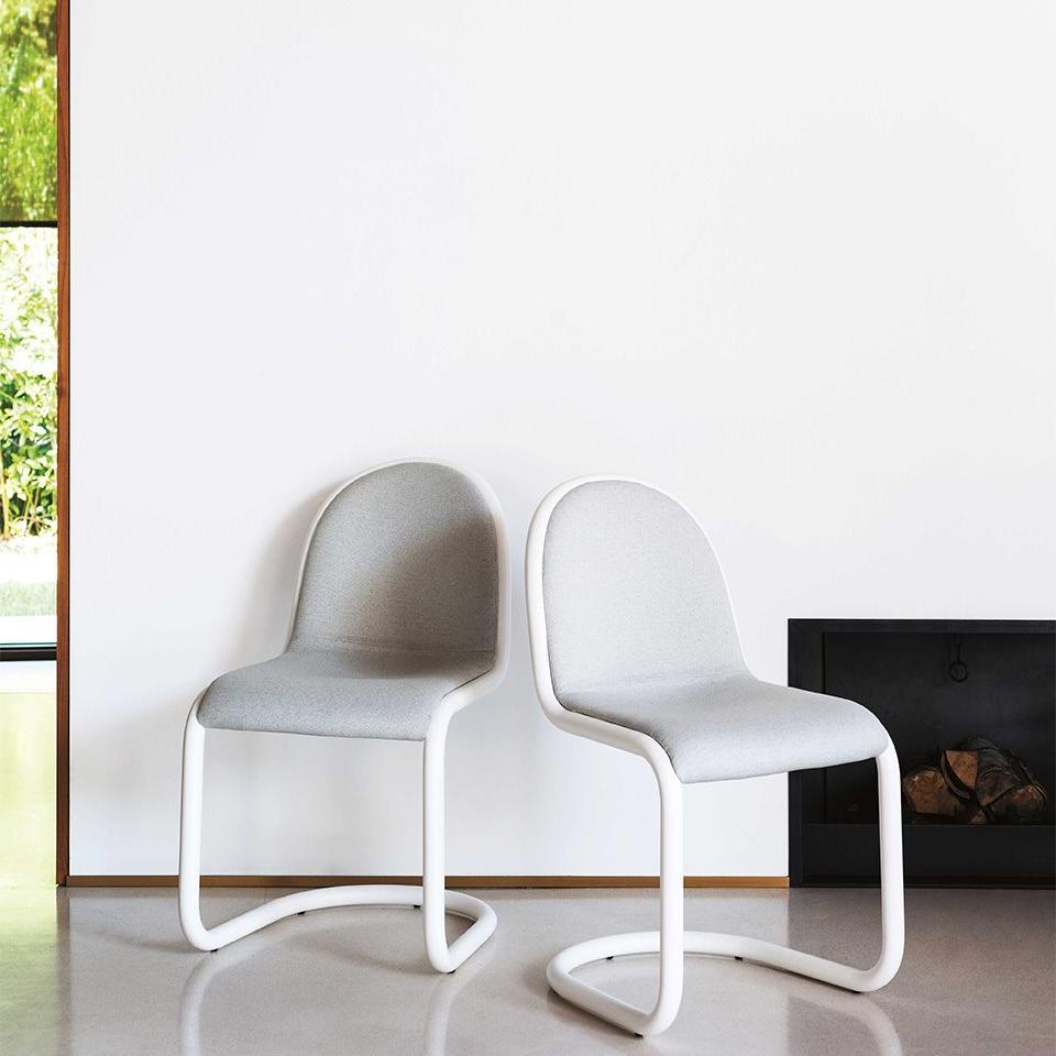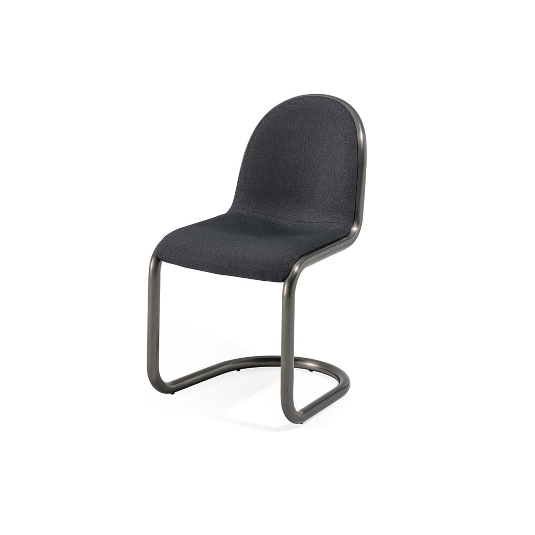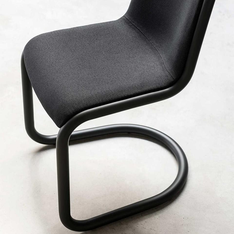 Стул с изогнутым трубчатым стальным каркасом диаметром 35 мм, мягким сиденьем с тканевым чехлом.