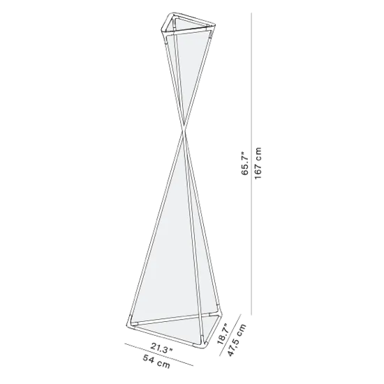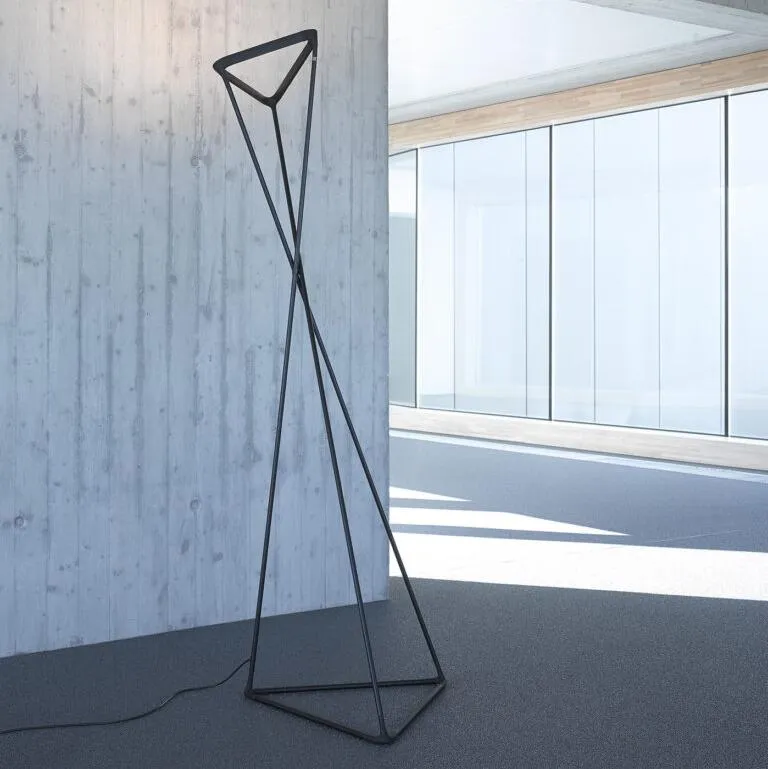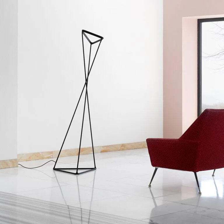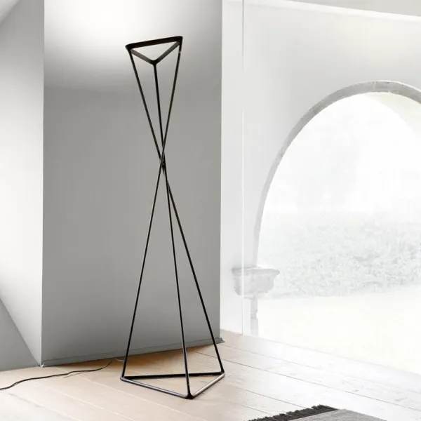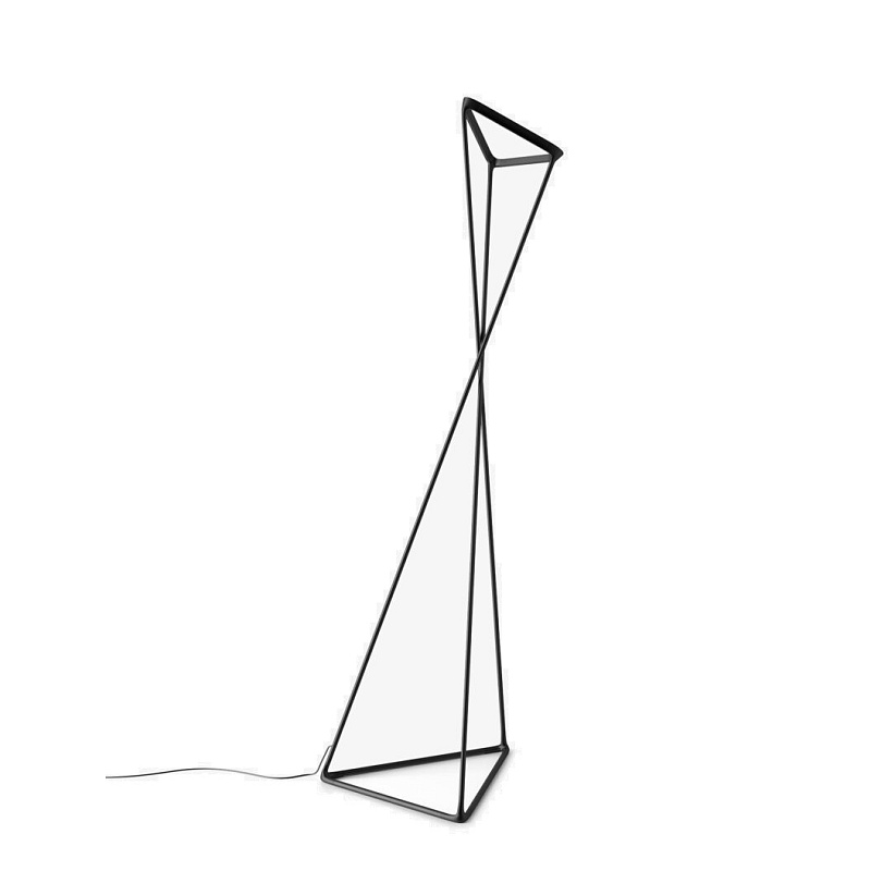 Инновационный торшер для непрямого освещения. Установленная на треугольном стальном основании шарнирная конструкция светильника, состоящая из трех подвижных алюминиевых стержней с эластомерными соединениями, легко поддается механическому вращательному движению, которое распространяется до верхней части светильника или до положения отражателя, который также имеет треугольную форму, задавая его угол наклона и создавая это позволяет направлять свет туда, куда это необходимо.