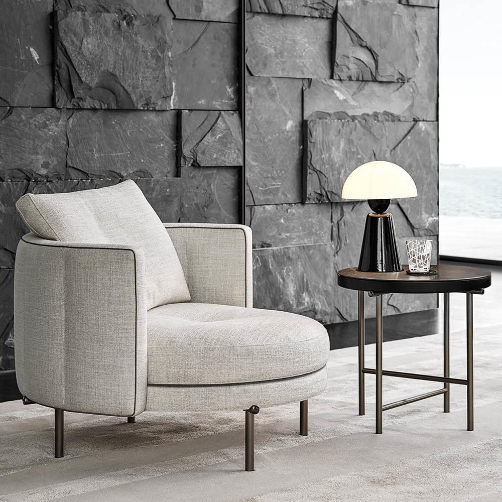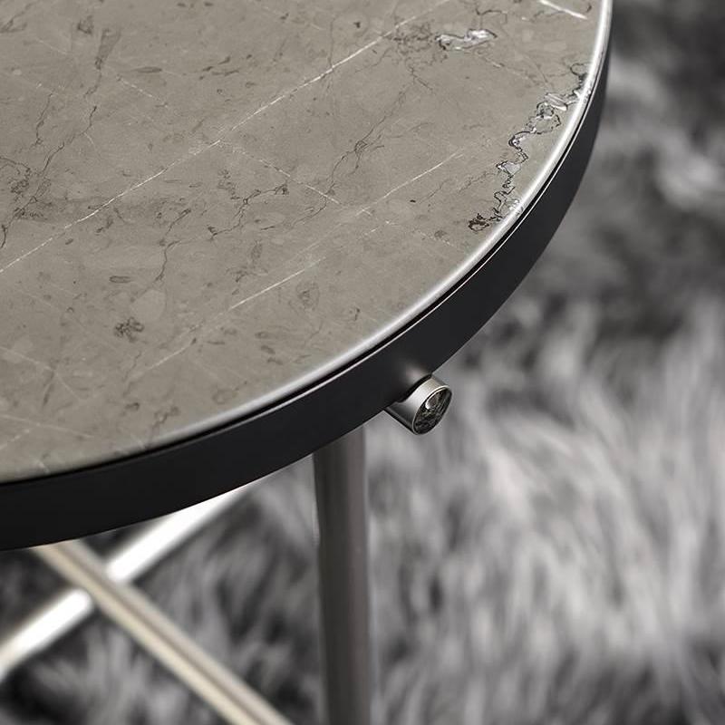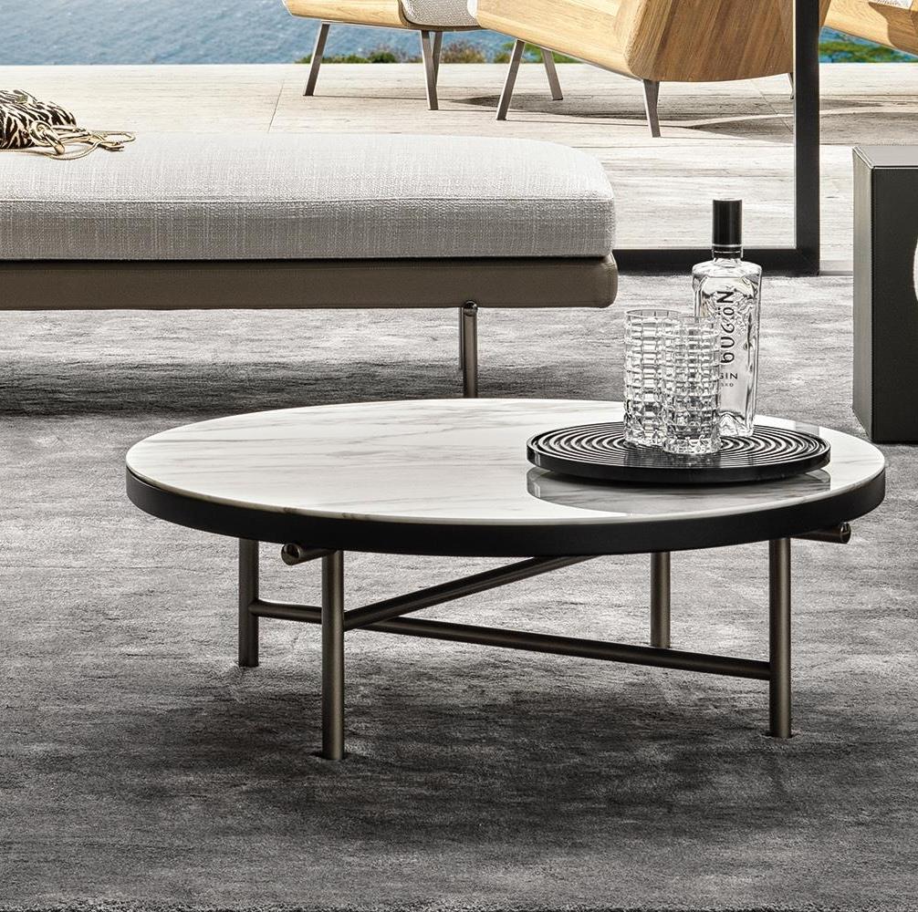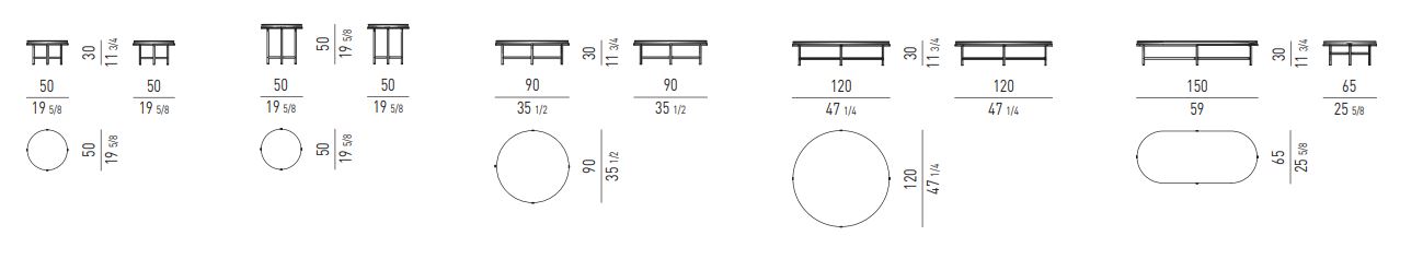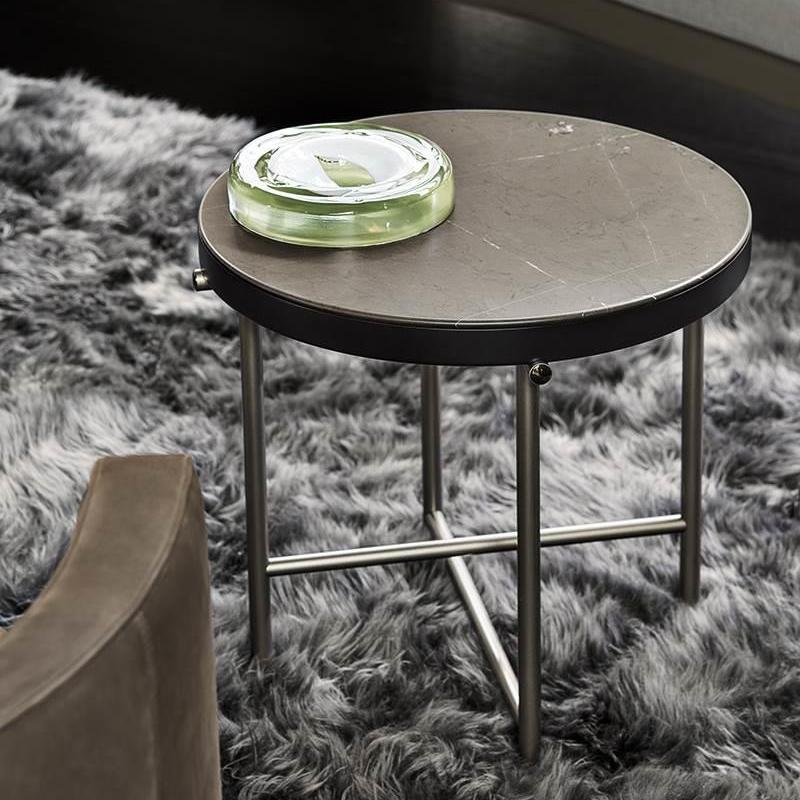Доступные в различных размерах, достигающих впечатляющего диаметра 120 см, и разной высоты, они имеют столешницу из калакатты или серого мрамора с матовой полиэстеровой отделкой.