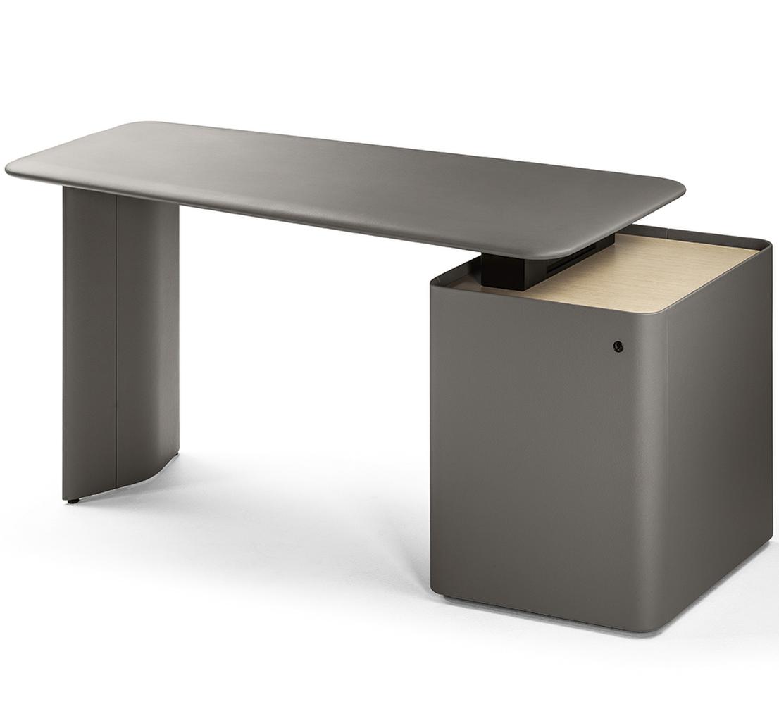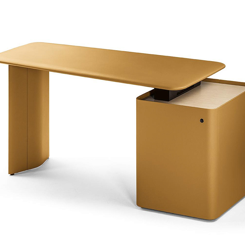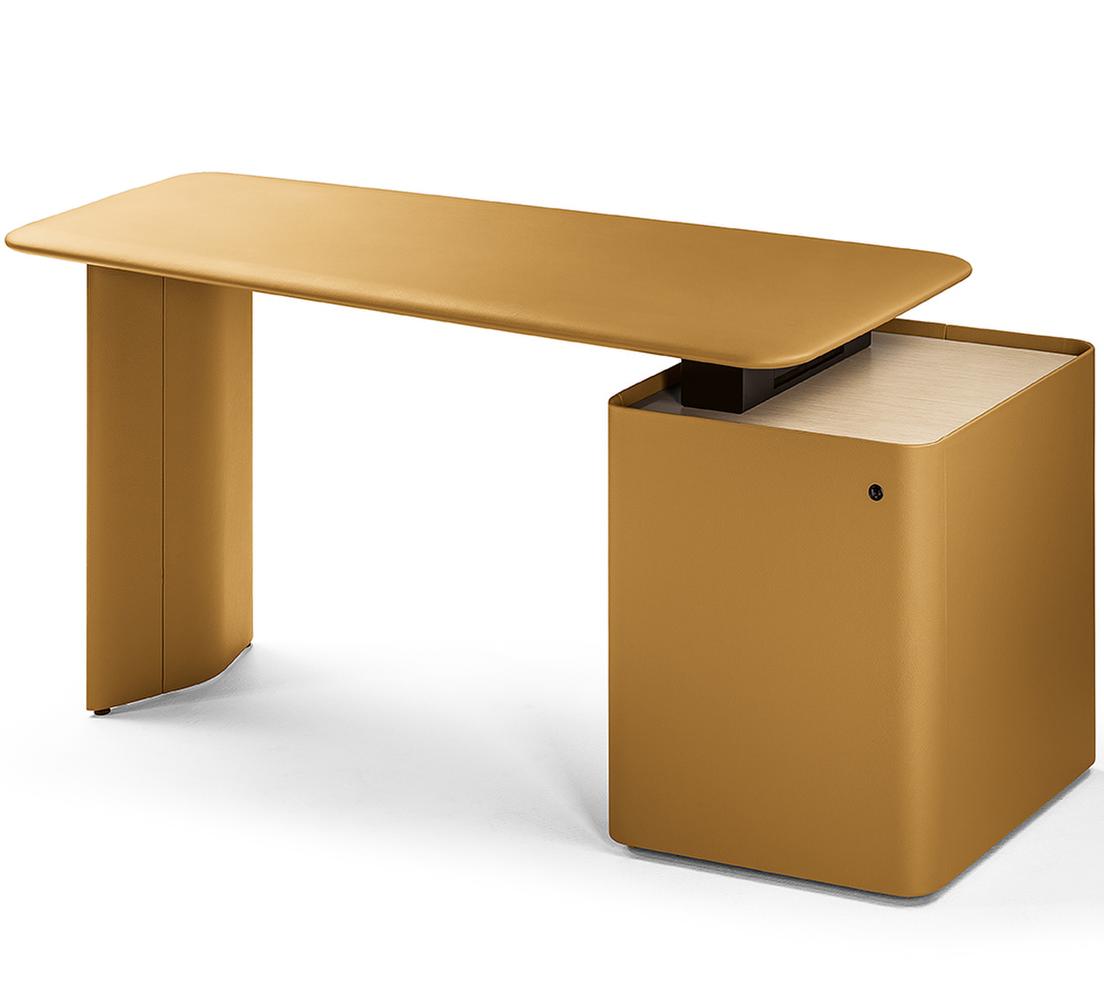 Техно-дерево с отделкой из седельной кожи или кожаной рабочей поверхностью или, как вариант, с рабочим столом, полностью обтянутым седельной кожей или кожзаменителем.