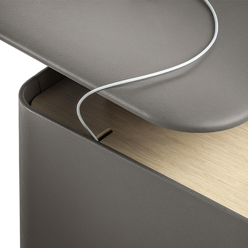 Столешницы могут быть дополнены приспособлениями для чистки кабелей или, в кожаном исполнении, дверцей для прокладки кабелей.