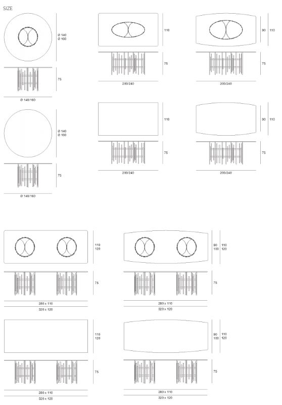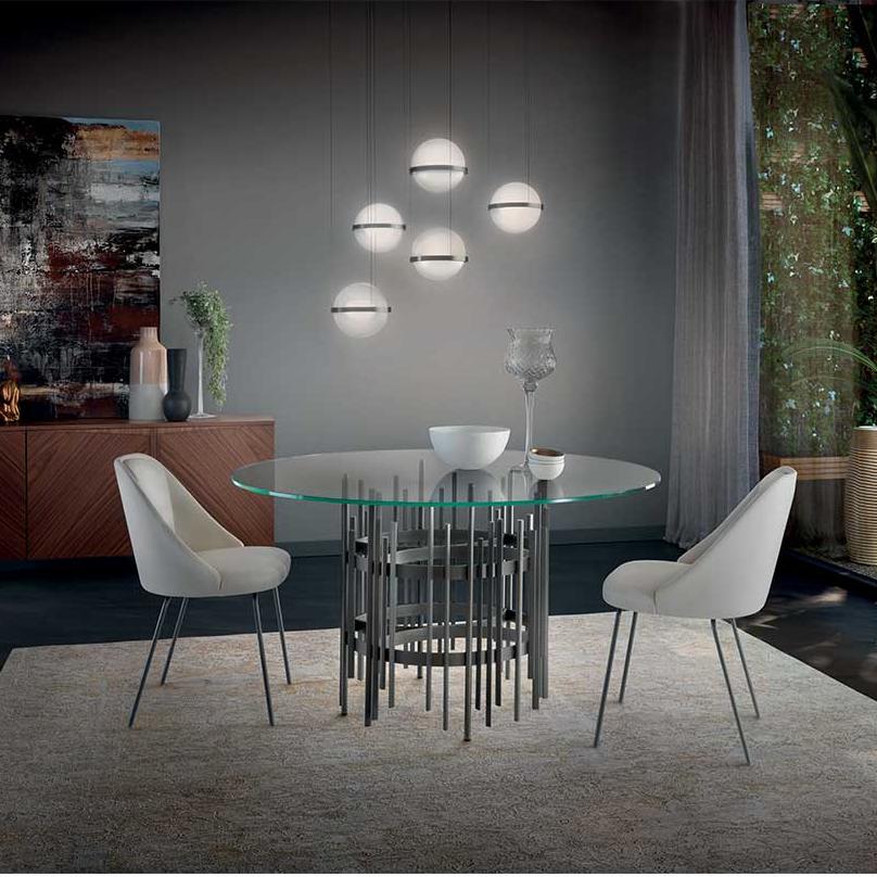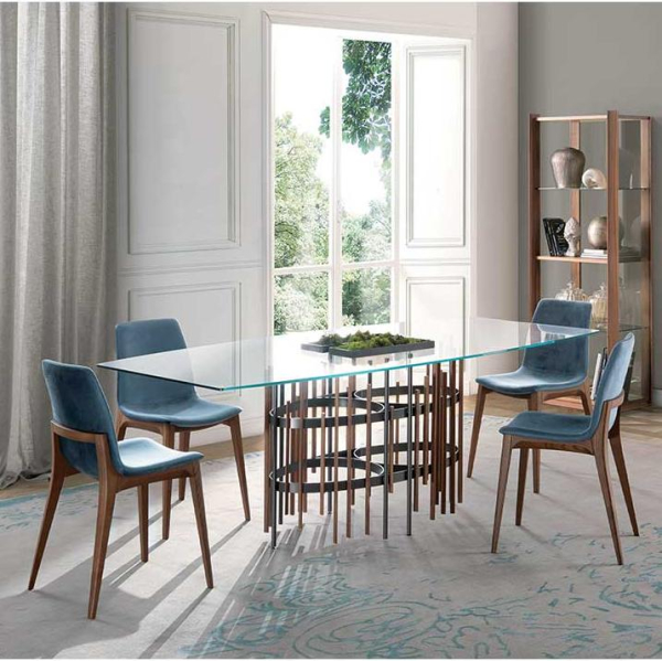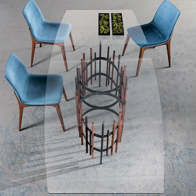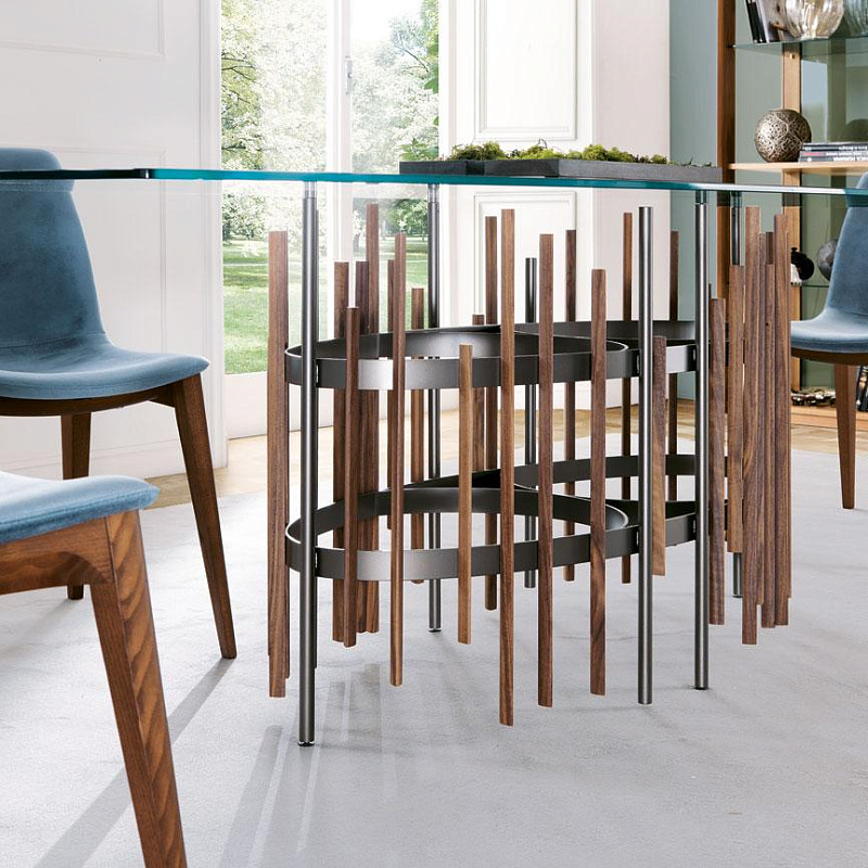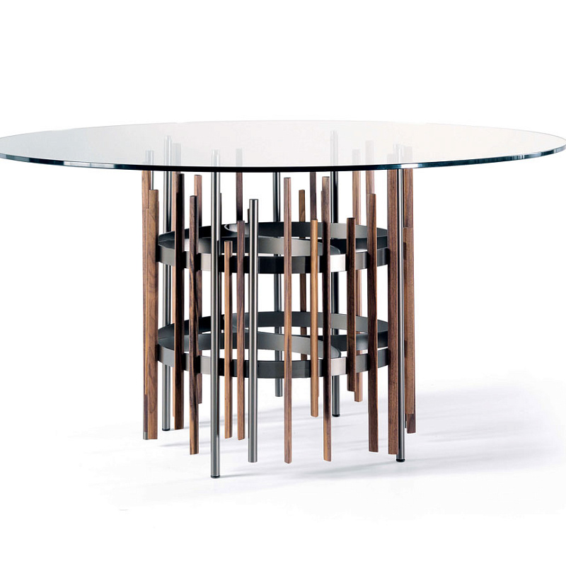 Доступный в различных формах и размерах, с одним или двумя основаниями, на которые опирается деревянная, стеклянная или мраморная столешница. Стол хорошо подходит для помещений, где требуется безупречный вкус и элегантность. Обеденный стол с металлическим основанием, окрашенным в титановый цвет, и деталями из массива ясеня или ореха каналетто. Столешница из закаленной прозрачной бронзы или дымчатого стекла толщиной 10 или 12 мм с электросварными опорами, из шпонированного ясеня или ореха каналетто или из полированного натурального мрамора.