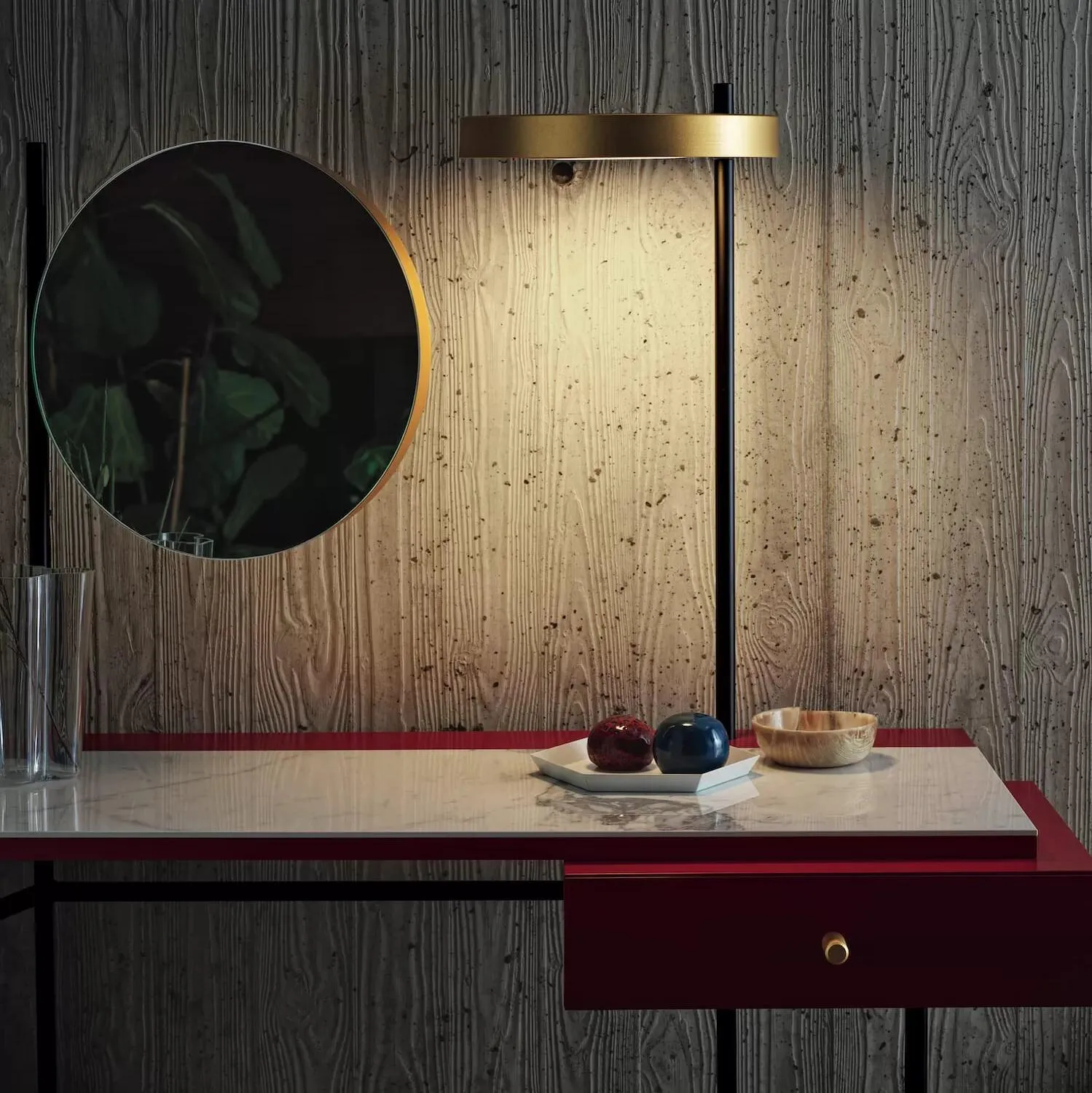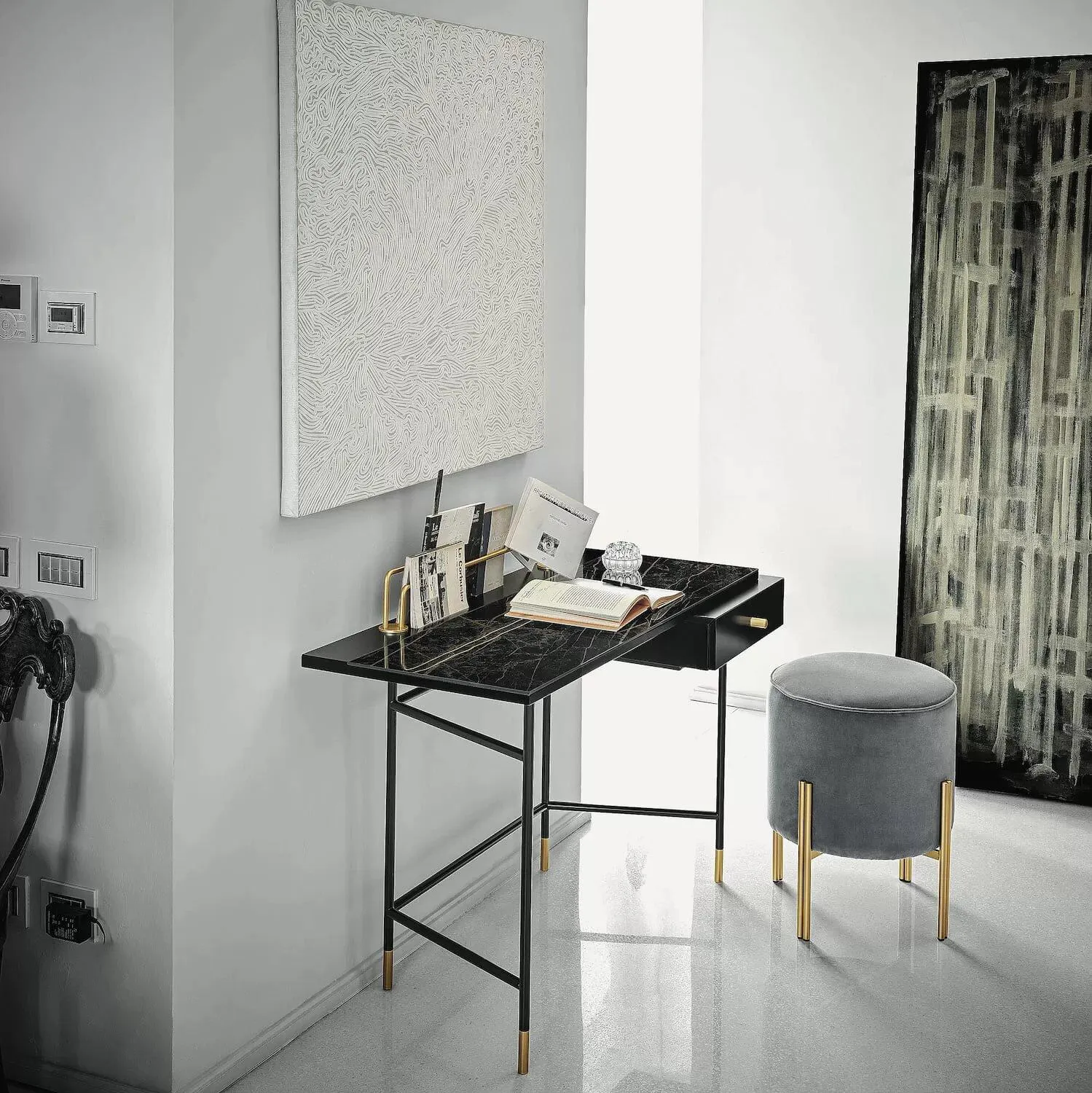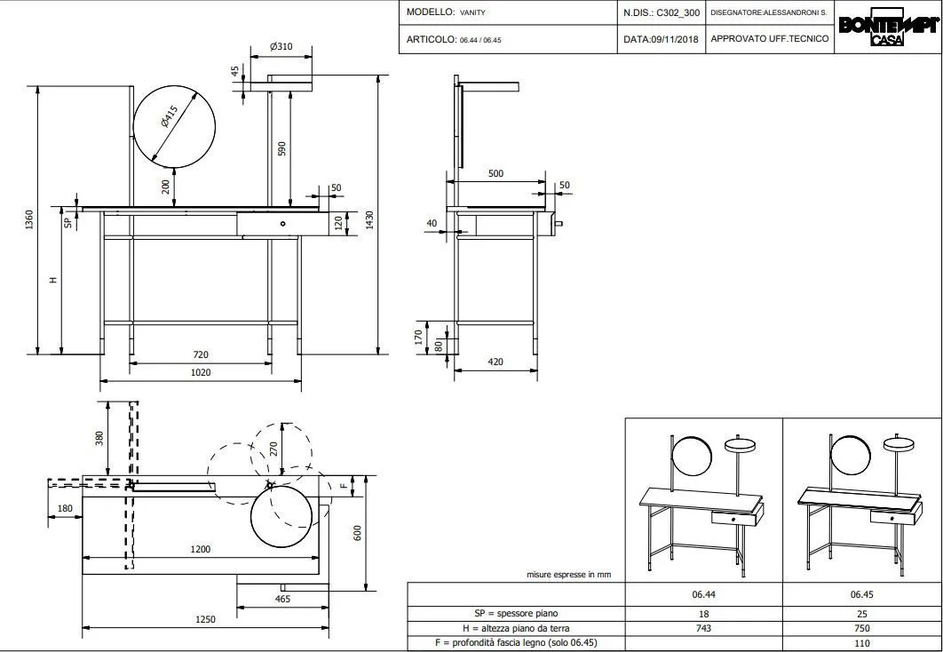 Консоль с регулируемым зеркалом и подсветкой, только для зеркала или только консоли. Каркас из лакированного металла. Декоративные детали (ножки, ручка выдвижного ящика, подставка для зеркала и подсветка) из лакированной стали. Столешница и выдвижной ящик из меламина.