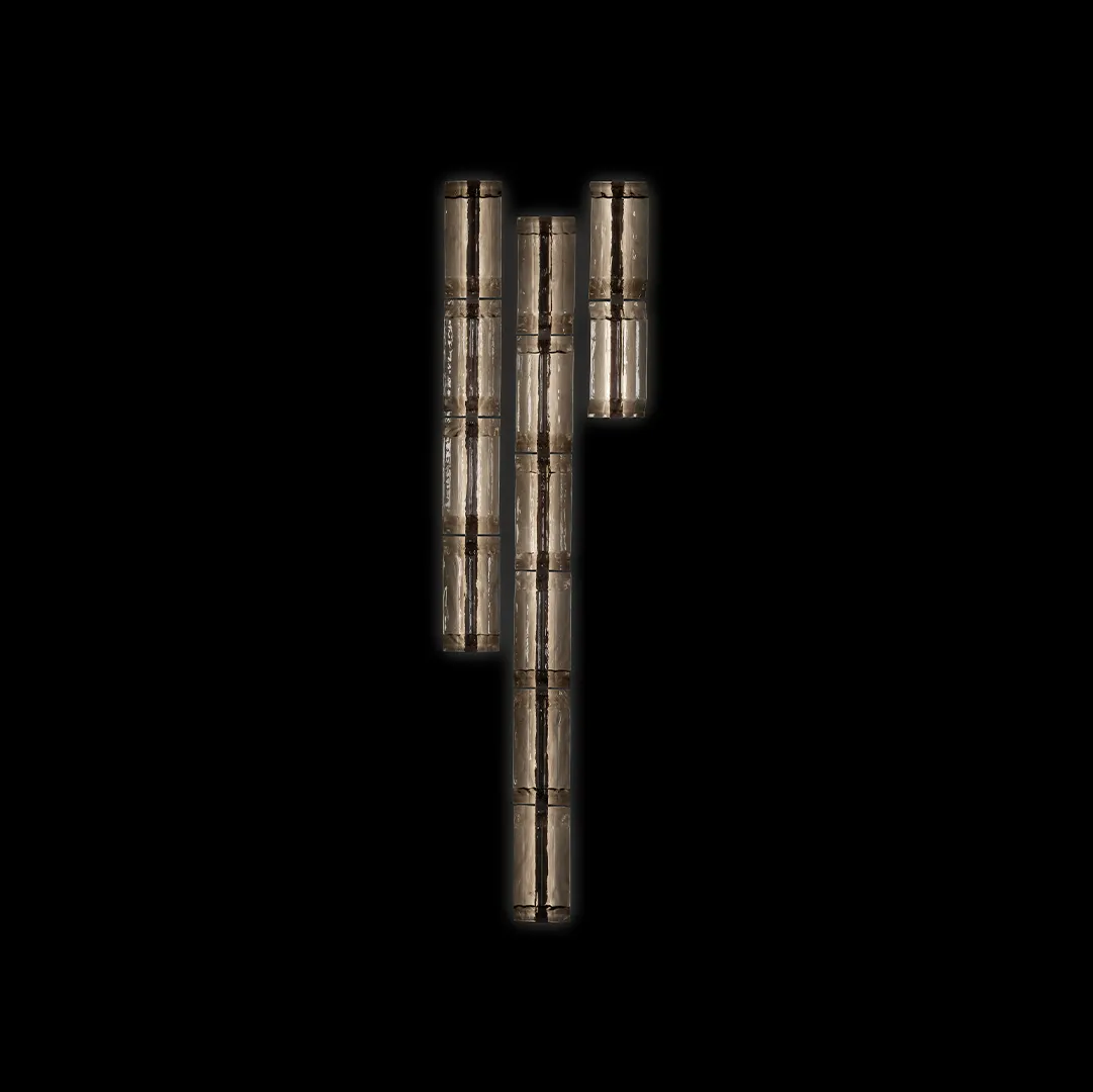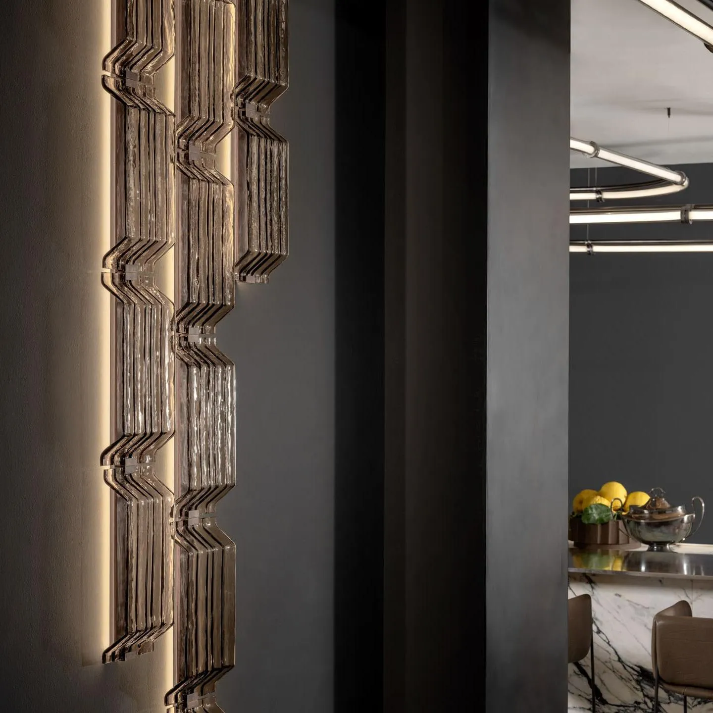Светильник похожий на световую скульптуру: текстурированные плитки из выдувного стекла чередуются по вертикали вдоль стены в игре бесконечных переливов и нюансов света и прозрачности и отражений.
