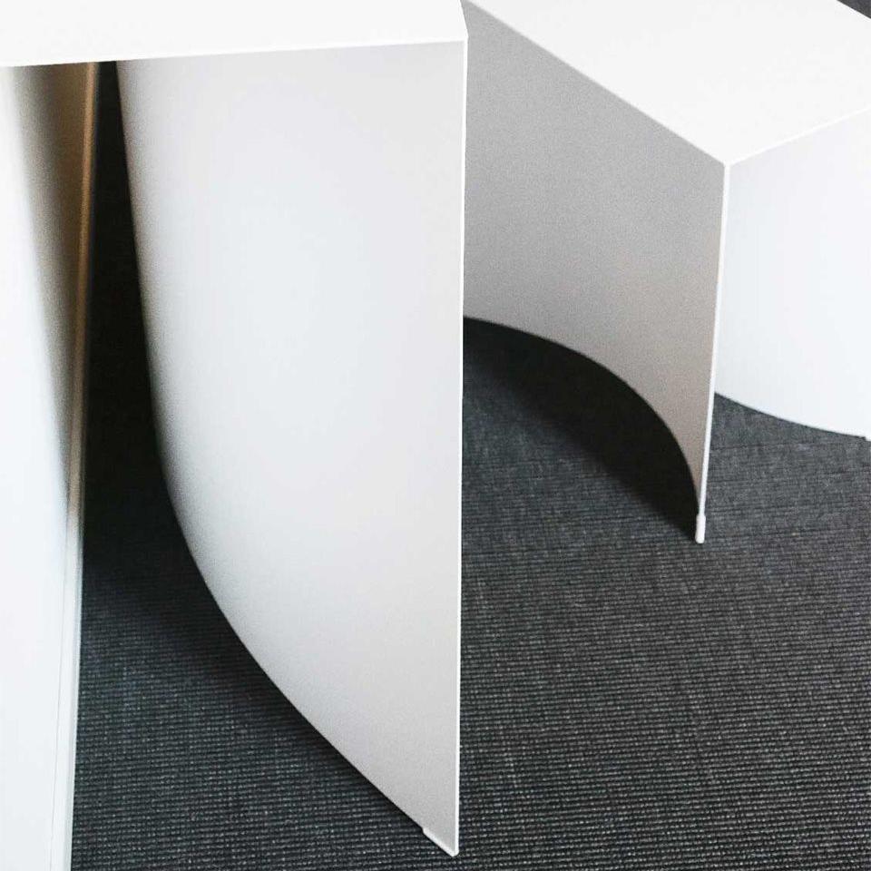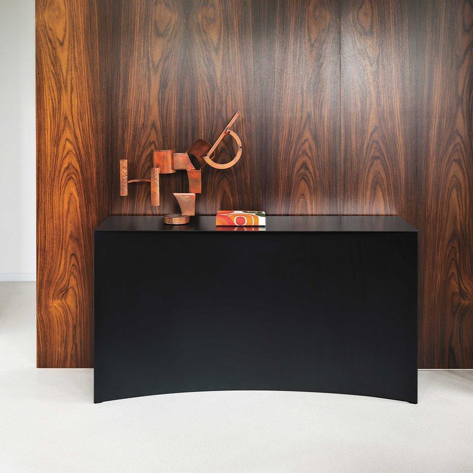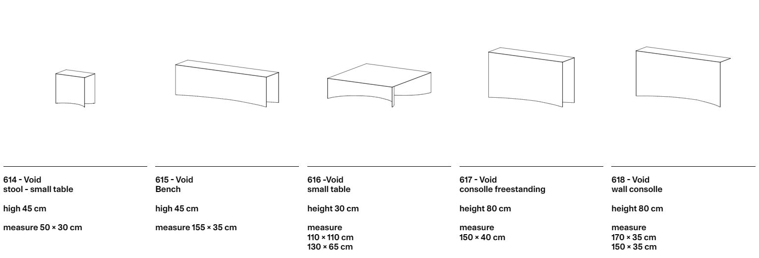 Серия Void основана на исследовании формы в связи с архитектурными концепциями массы и пустоты. Этот тонкий акт вычитания приводит к сильному эффекту благодаря изгибу основания, который определяет пространство, способное изменить визуальное восприятие объектов.