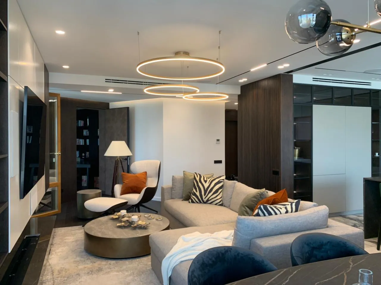 Квартира в ЖК "Монблан" с интерьером в современном стиле с использованием новейших тенденций в мире дизайнерского освещения.