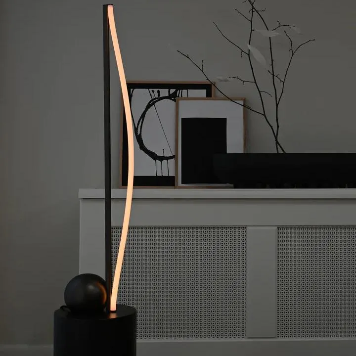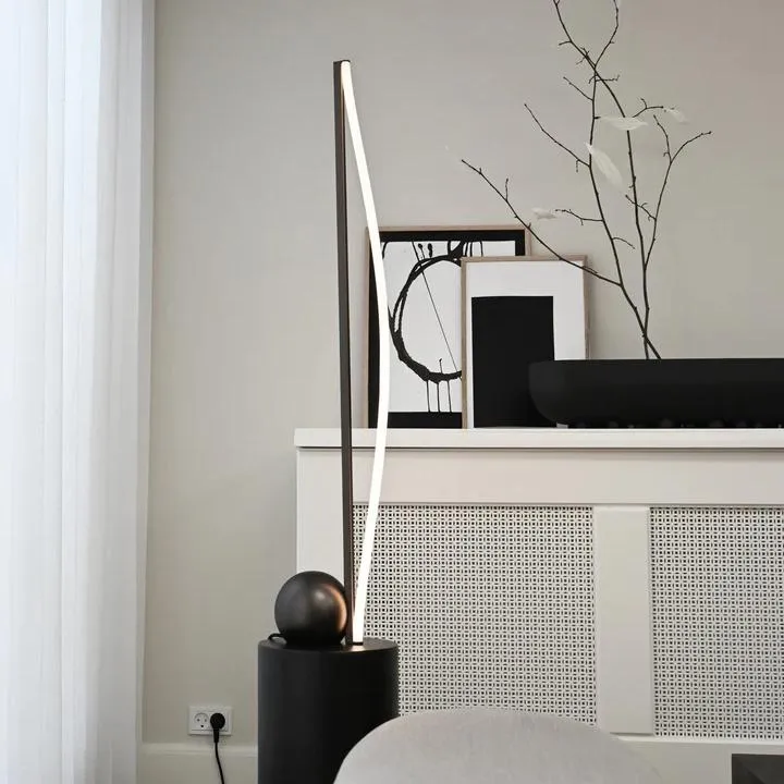 Светящаяся акриловая трубка в форме струны классического смычка придает светильнику нежный и артистичный вид. Изогнутый абажур закреплен на скульптурном металлическом шаре, что создает завораживающий контраст между воздушным изгибом и его массивным аналогом.