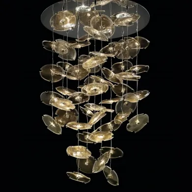 Золотистые стеклянные подвески ручной работы выполнены в форме листьев лотоса, парят в воздухе, освещаемые изнутри светом встроенных светодиодов.