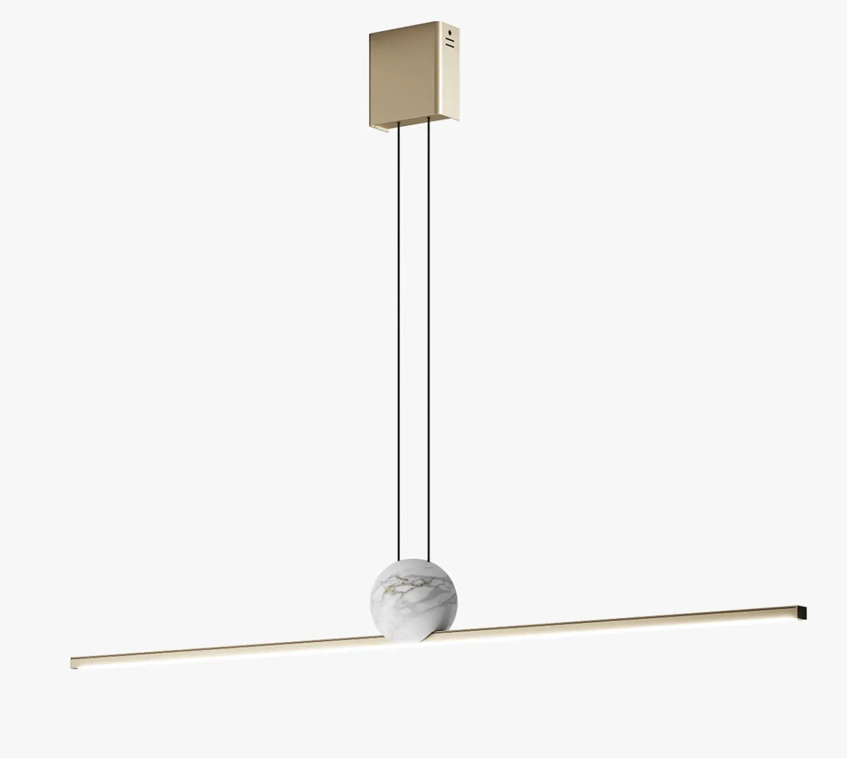 Подвесной светильник Regolo в минималистичном стиле, характеризующийся прямыми линиями и геометрическими формами. Сфера из золотого мрамора calacatta идеально сочетается с легкостью алюминиевой планки.
