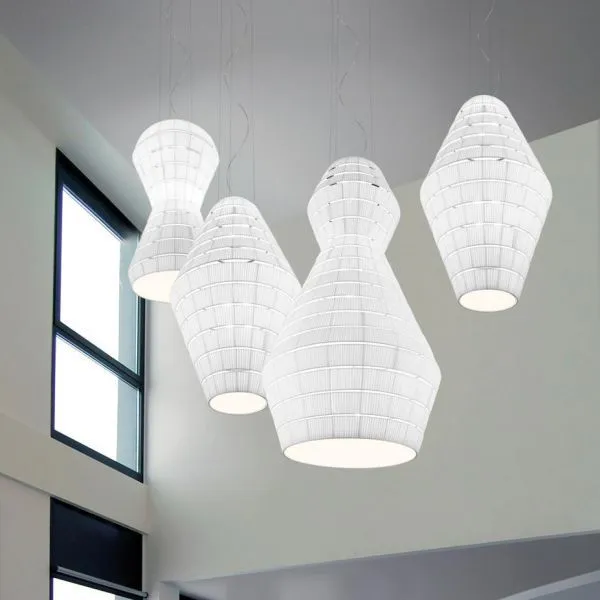 Коллекция потолочных и подвесных светильников с металлическим каркасом, покрытым полосками из очень гладкой огнеупорной ткани Ponge.