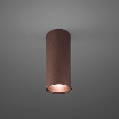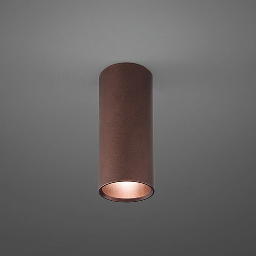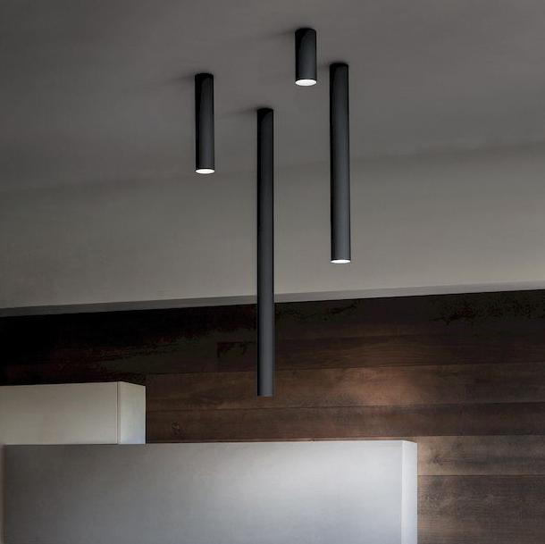 Потолочный накладной светильник цилиндрической формы, который указывает прямо на объектив. Простые линии, которые никогда не надоедают.