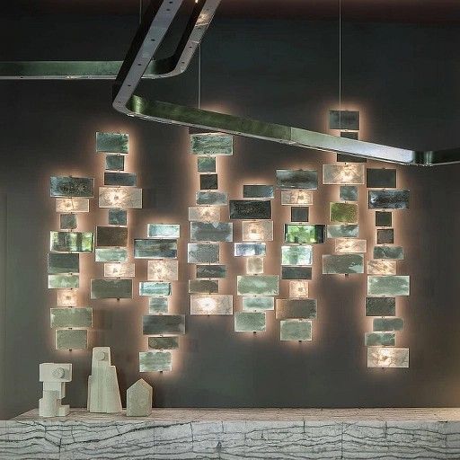 Элегантные светодиоды прикрыты квадратами из латуни и кварца, что создает неповторимый узор на стене и уютную атмосферу в пространстве.