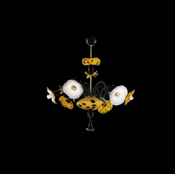 Ультрасовременная люстра исполнена из муранского стекла в янтарно-желтом и черном цветовом варианте с черным оформлением.
