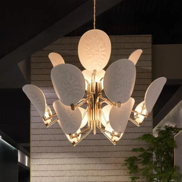 Вогнутые “веерообразные” абажуры из ткани с цветочным принтом или по образцам с внутренним муаровым рассеивателем. Металлические детали доступны в ассортименте с металлической отделкой.