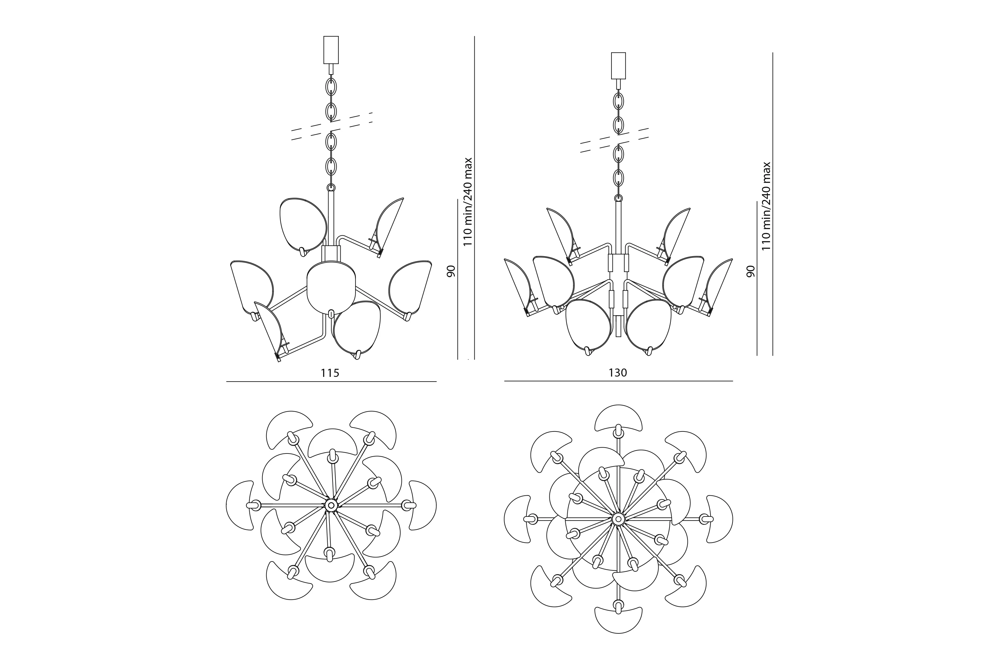 Люстра на 12 или 16 ламп из полированного или матового металла. Изогнутые кронштейны крепятся к центральной раме с помощью элементов из цельной латуни.