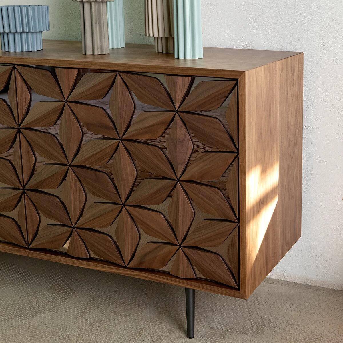 Комод All Star сочетает в себе свой неповторимый внешний вид с драгоценным созвездием лепестков ручной работы из массива дерева, которые покрывают дверцы с зеркальными основаниями, создавая уникальный элемент дизайна и высокое мастерство исполнения.