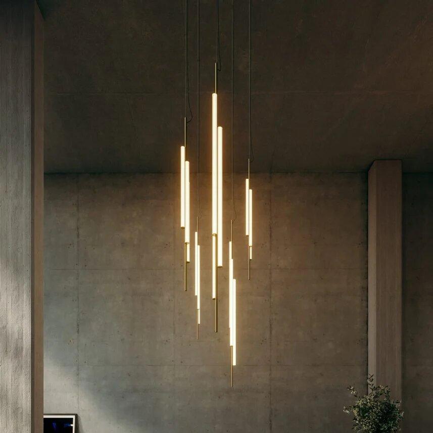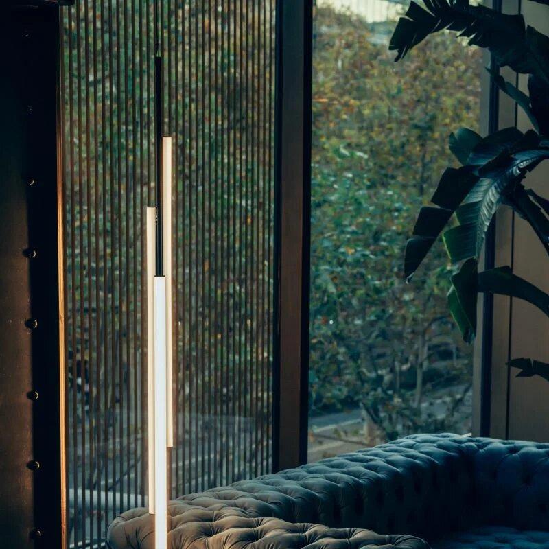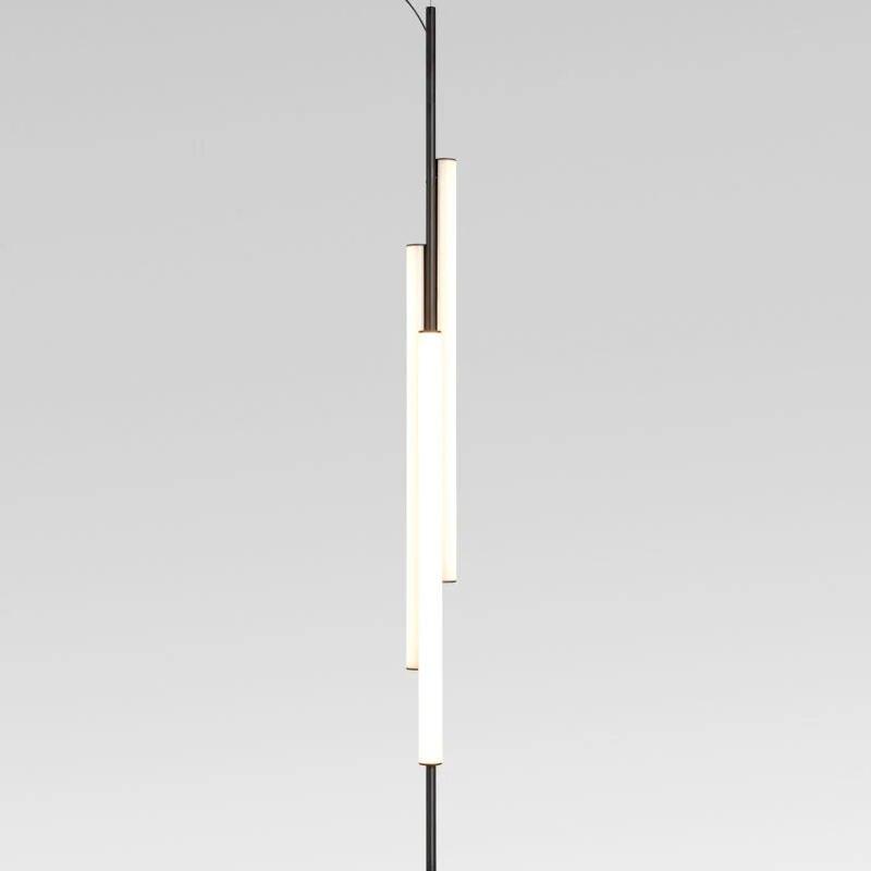 Ambrosia V2 - вертикальная конструкция высотой 235 см, состоящая из двух световых трубок разной длины. Прерывистая линия света - деталь, придающая светильнику легкость и характер. Его дизайн позволяет выбирать освещение, направленное либо на стену для непрямого освещения, либо на основное пространство для прямого освещения. Этот эстетичный и функциональный дизайн также хорошо подходит для домашнего интерьера.