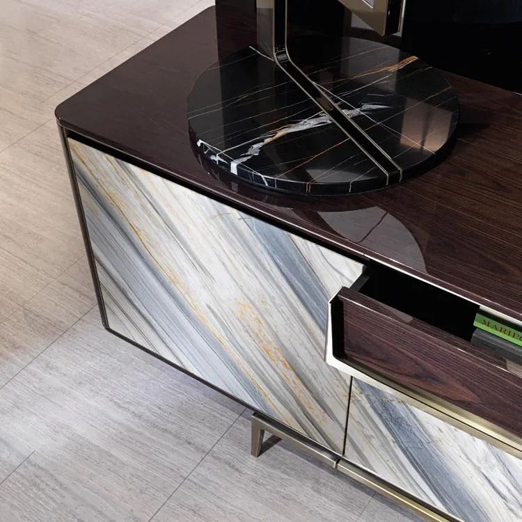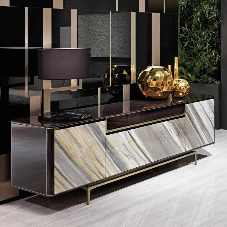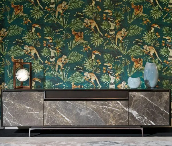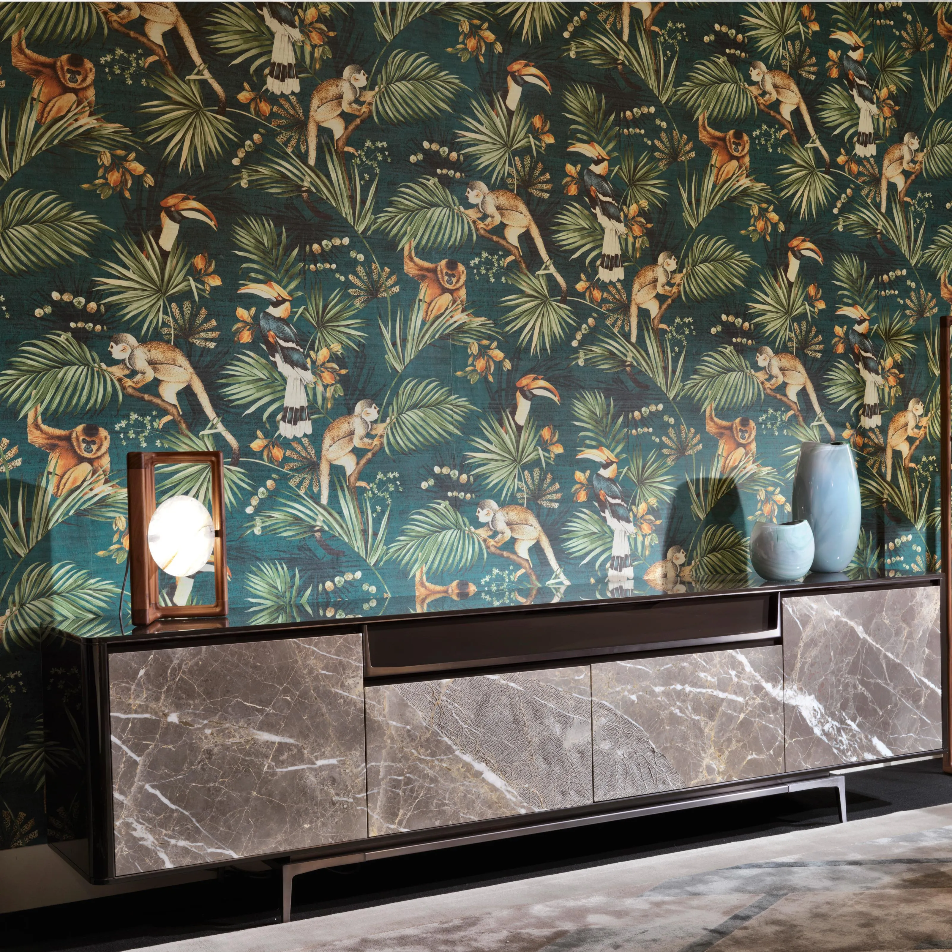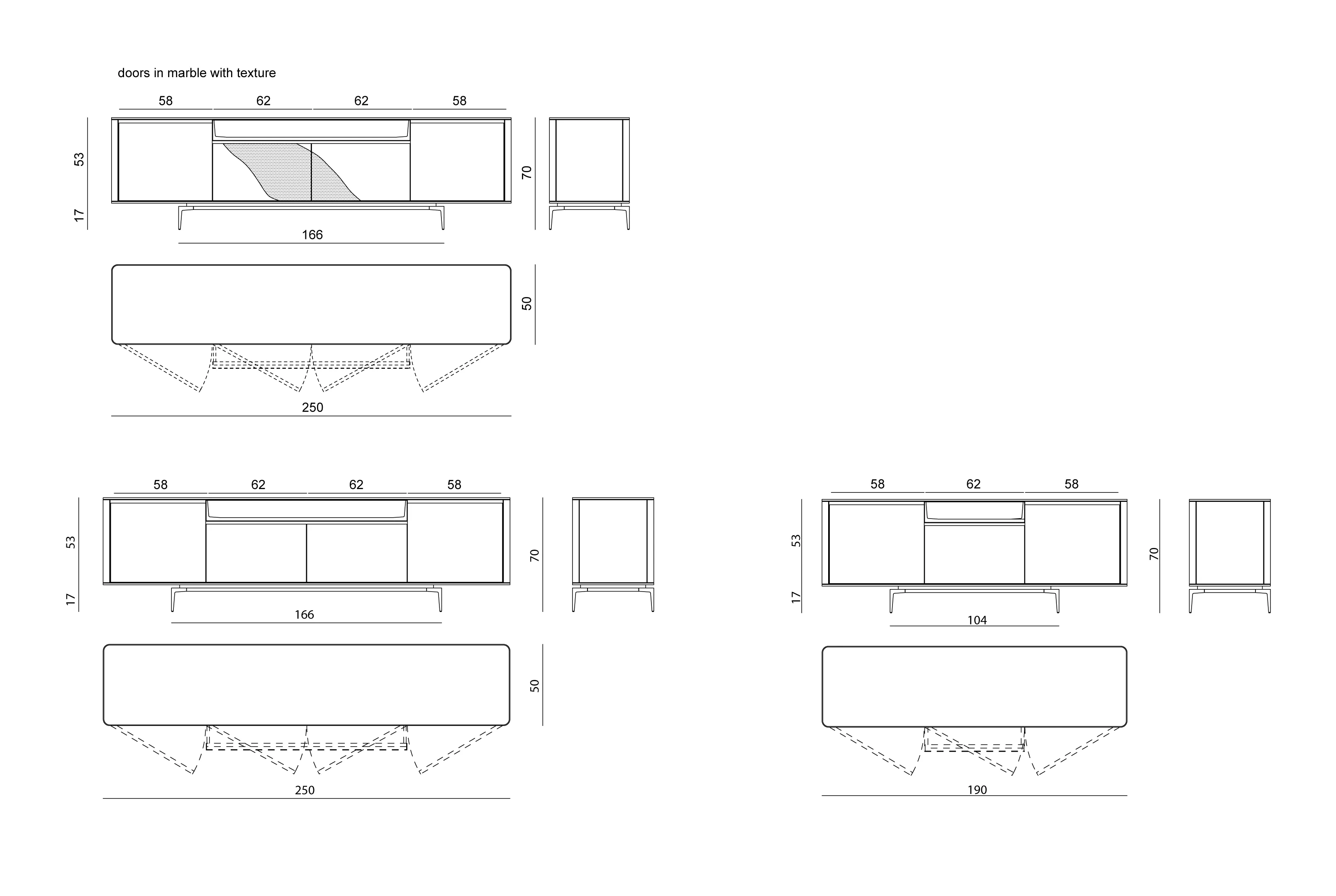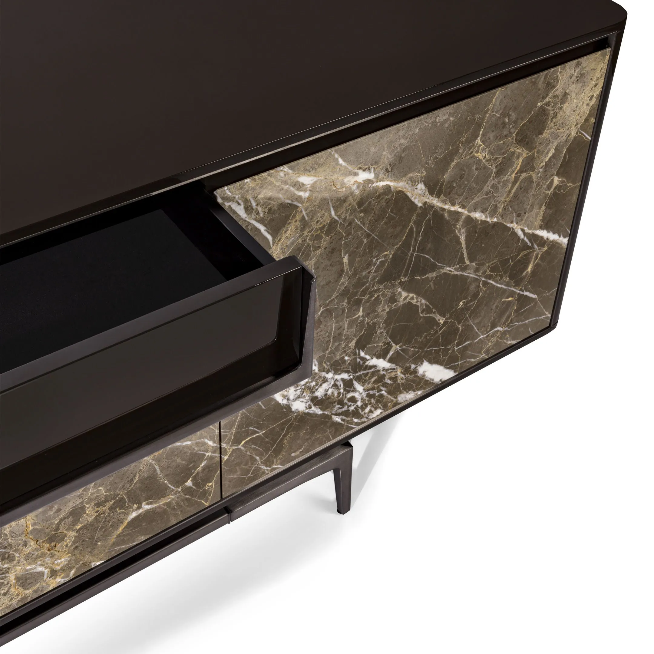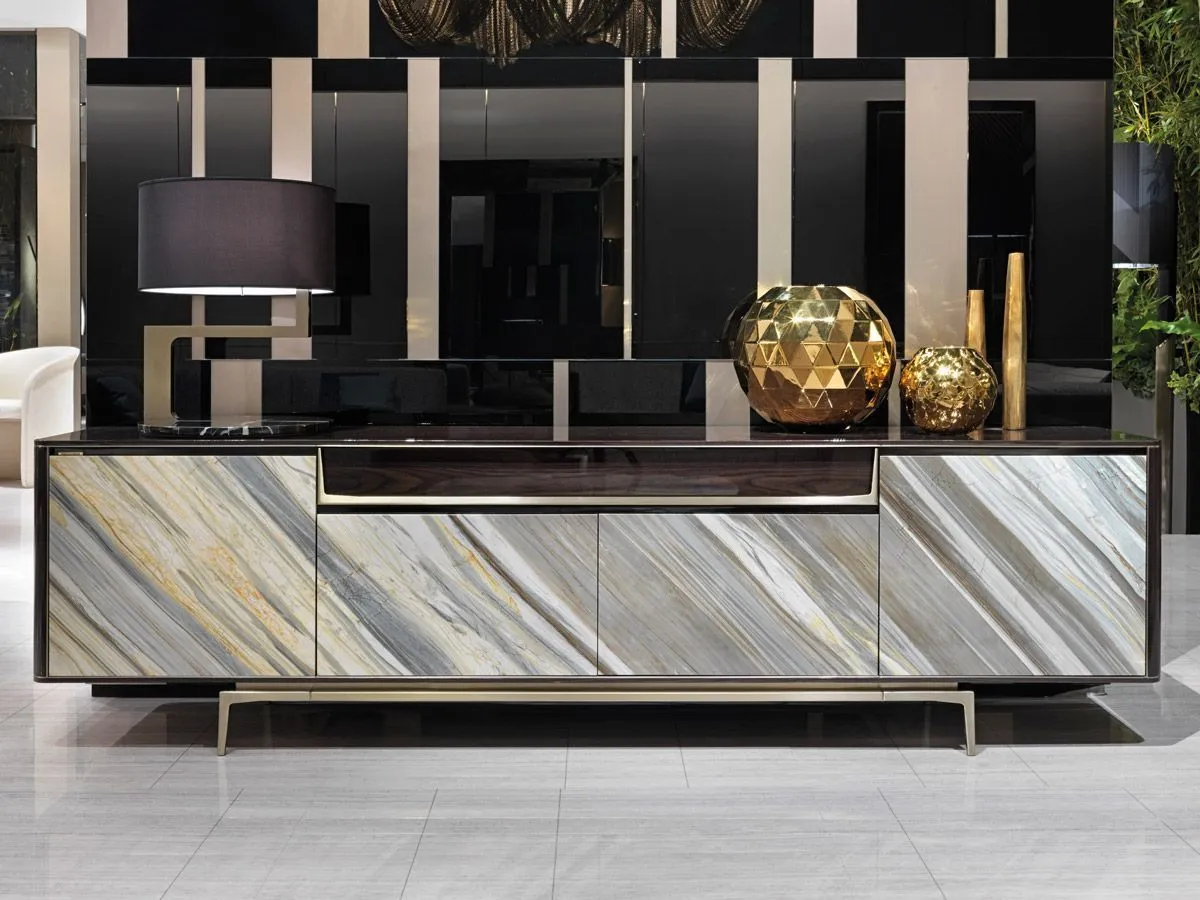 Комод с 4 дверцами и 1 выдвижным ящиком, конструкция из МДФ, покрытая шпоном, со вставками из сатинированной нержавеющей стали, встроенными в дерево. Ручка и основание большого ящика из сатинированной нержавеющей стали. Дверцы из мрамора во всю толщину, внутренние детали покрыты матовым лаком, спинка покрыта матовым лаком, доступна из шпона дерева. Шпонированные детали доступны в вариантах отделки шпоном. Металлические детали доступны в вариантах отделки сатинированным металлом. Опция: текстура “змея” на мраморе Colle Mandina на двух центральных дверях, обработанная вручную Диего Крестани.