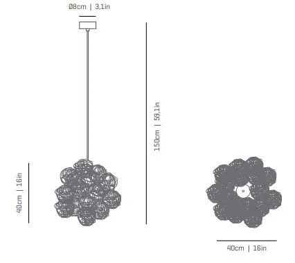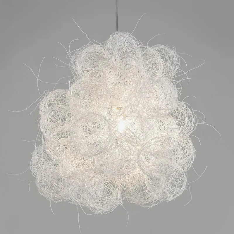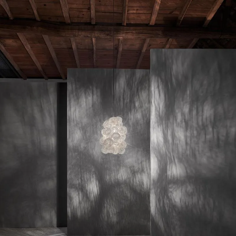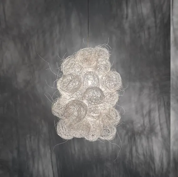 В дизайне этой коллекции Артуро Альварес привносит стальную нить в свой репертуар материалов. Оборачивая ее вокруг себя, он создает сферы, которые позже соединяет в воздушные, почти прозрачные объемы, придавая этому подвесному светильнику утонченную красоту. Его белая отделка подчеркивает изысканность изделия, изготовленного вручную из холодного, как сталь, материала, который сейчас, кажется, наполняется жизнью.