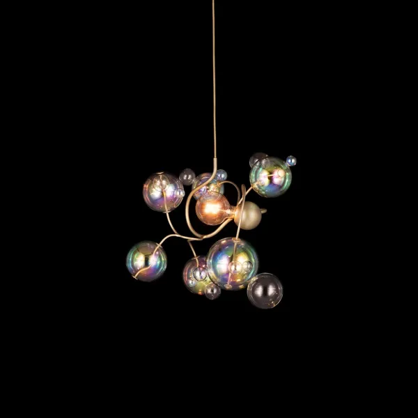 При включении люстра Bubbles Swirl преображается. Свет, проходя через десятки стеклянных сфер, многократно преломляется, создавая на стенах и потолке мягкие, подвижные блики. Это не просто освещение, а настоящая игра света и тени, которая наполняет помещение теплой, уютной и одновременно роскошной атмосферой. Такой светильник из металла и стекла станет идеальным решением для гостиной с высокими потолками, освещения лестничного пролета или в качестве центрального элемента над обеденным столом.