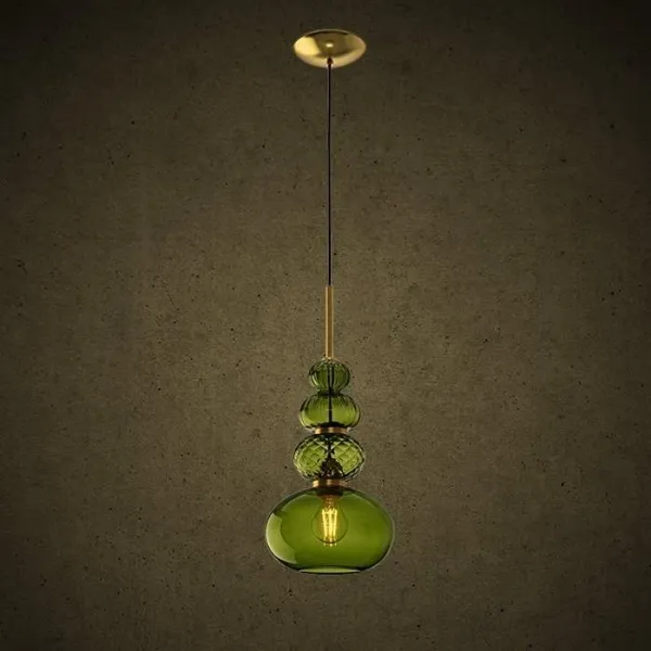Подвесной светильник выполнен из стекла ручной работы зеленого цвета и металлической арматуры в цвете латунь.