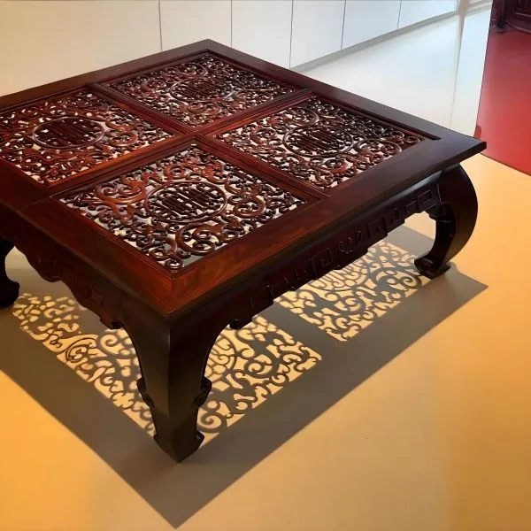 Стол квадратной формы с изящными узорами на поверхности и резными ножками. Отбрасывает тени в виде узоров, повторяя узор на поверхности.