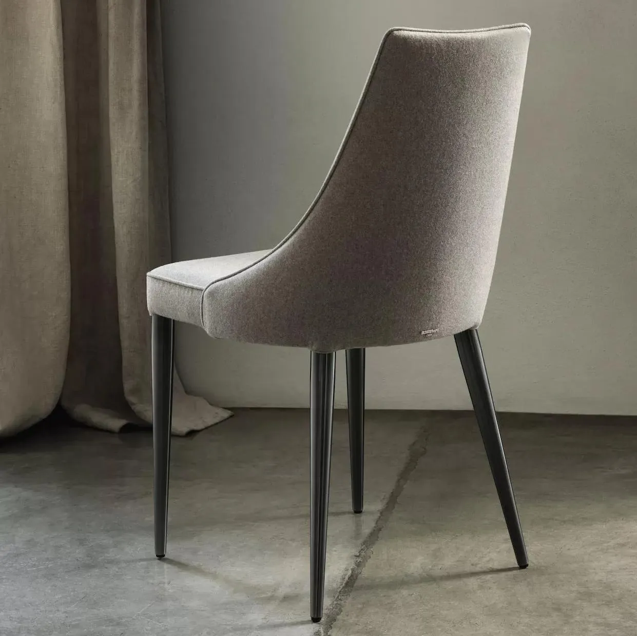 Стул с мягкой обивкой или с ножками в металлическом лакированном каркасе. Окантовка может быть соответствующего цвета или контрастного. Также доступно в варианте со стеганой спинкой (только для ткани Nordic, экокожи премиум-класса и кожи наппа премиум-класса).