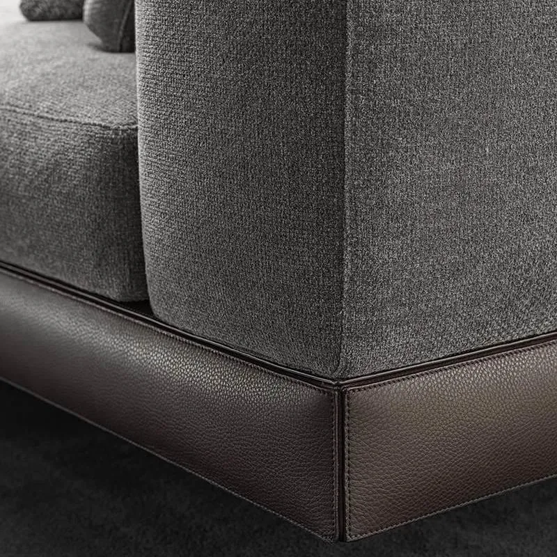 Конструктивное основание, приподнятое над полом на тонких ножках из экструдированного алюминия с лакированным покрытием цвета бренди, расположено спереди, что придает дивану привлекательный и воздушный вид и напоминает металлические детали чемоданов.