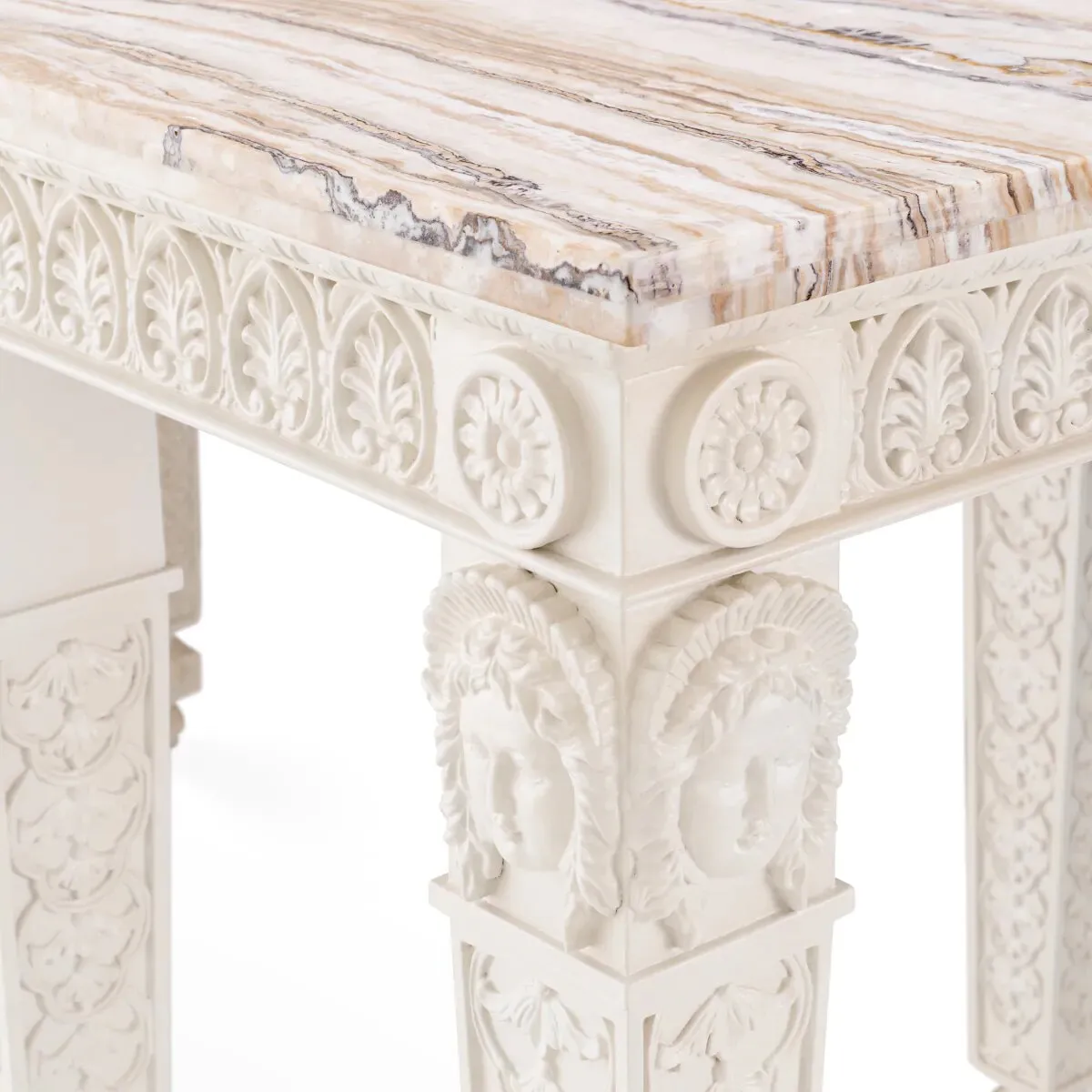 Стол с белой отделкой под старину и мраморной столешницей. Его дизайн отражает изысканную, почти кинетическую энергию штукатурки Alken, в которой органично сочетаются историческое очарование и современная элегантность.