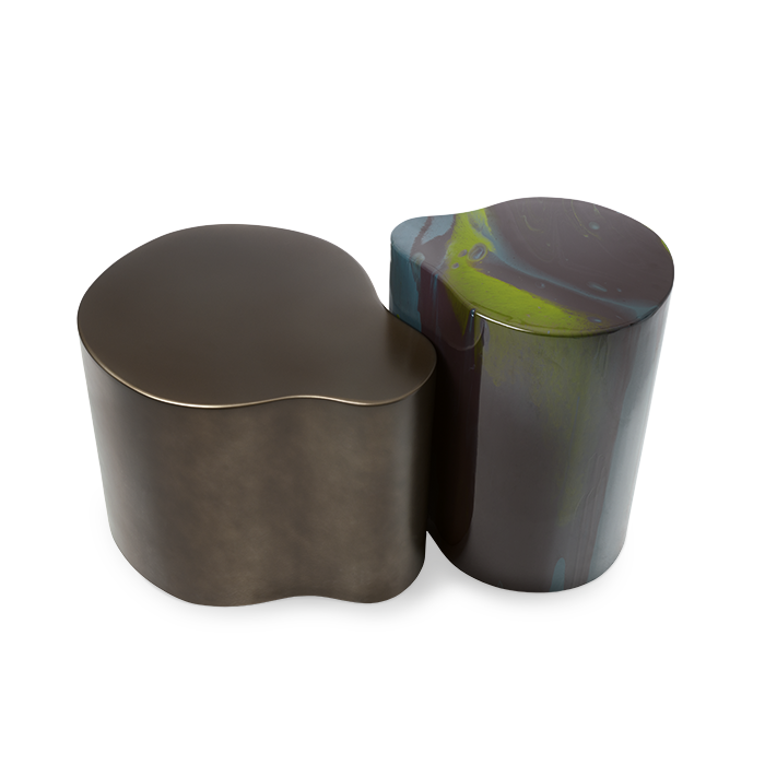 Набор низких столиков двух размеров с деревянной конструкцией и покрытием из смолы.