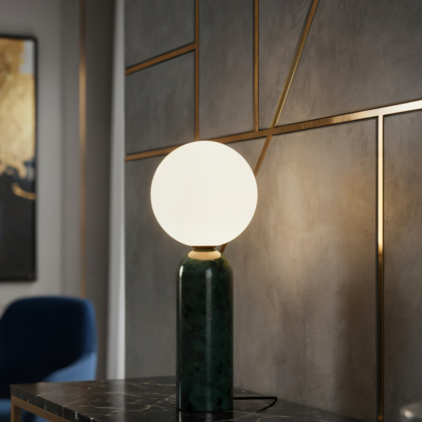 Основание изготовлено в двух вариантах из зеленого гватемальского или белого мрамора Калакатта. В нашем салоне на экспозиции есть вариант с зеленым мрамором. Рассеиватель представляет собой очаровательную сферу из белого опала, которая, благодаря своей чистой эссенции, равномерно распределяет свет.