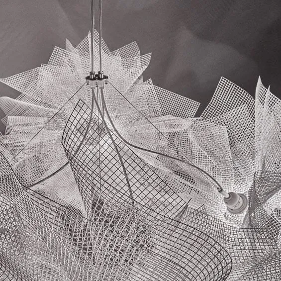 Светильник Fluo , разработанный Артуро Альваресом (Arturo Álvarez), является частью коллекции подвесных светильников, созданных из сетки из окрашенной оцинкованной стали, которые изящно соединены вокруг одной световой точки. Соединение нескольких элементов образует эффектную композицию больших размеров.