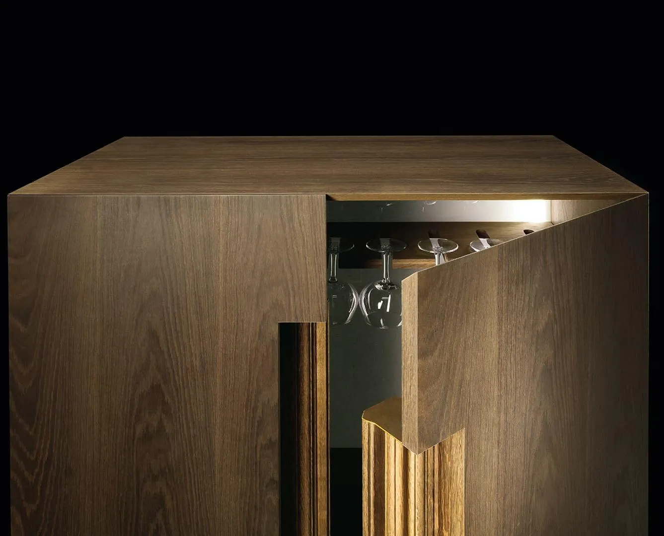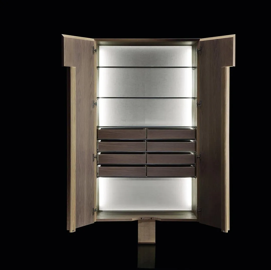 Эстетические принципы бренда определяют компактность и стройность корпуса Frame cabinet: выразительный контраст материалов и длинная, глубокая скульптурная гравировка. Искусная подсветка подчеркивает удивительный плавающий эффект объема.